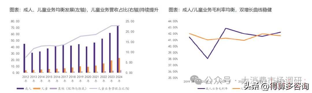 ➢公司成人、儿童分部业务均衡发展,近年均维持双位数增长速度;盈利能力均衡,毛利率均稳定在约41-42%。成人鞋服业务稳中有进,疫情后营收增速稳定在13%以上,2024年达19.09%。