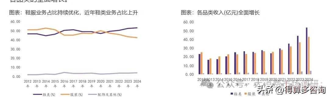 鞋服占比稳定且持续微调,短期鞋服业务占比的优化符合行业专业化、细分化的长期趋势。公司以鞋服为主要业务,持续优化各业务占比。近年鞋类业务占比维系上升趋势,2024年鞋类收入占比53.46%,服装占比42.73%;公司向鞋类产品的资源倾斜,有利于其在跑步鞋、篮球鞋等核心赛道建立竞争优势。2020-2024年鞋类、服装、其他三个分部营收的五年CAGR分别为22.13%、13.66%、31.78%,增速均为双位数,显现出各品类的全面增长。