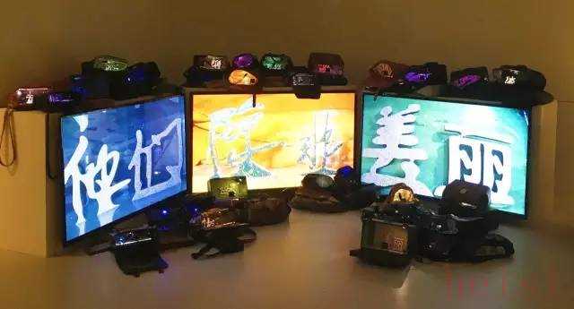 中国年轻艺术家胡为一《集结》:由45个旧箱包组成,每个箱包中放置了由手工搭建的词语雕塑(词性被分成了名词、连词与动名词),并使用独立的摄像头持续拍摄它,并将箱包中的词语图像信号输入到视频切换器中。