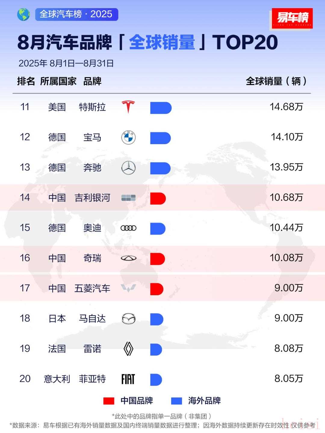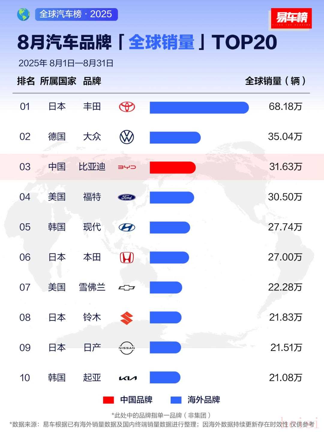 除丰田、大众、比亚迪三家品牌之外,美国福特以及韩国现代两家车企均进入榜单前五名,8月全球销量分别为30.50万辆和27.74万辆。此外,本田、雪佛兰、铃木、日产、起亚分别以27.00万辆、22.28万辆、21.83万辆、21.51万辆、21.08万辆的全球销量排名榜单第六至第十名。前十名之外,除了比亚迪,吉利银河、奇瑞、五菱汽车三家中国车企也均挤进8月全球销量榜单前二十名,分别排名榜单第十四、第十六和第十七名,全球销量分别为10.68万辆、10.08万辆和9.00万辆。