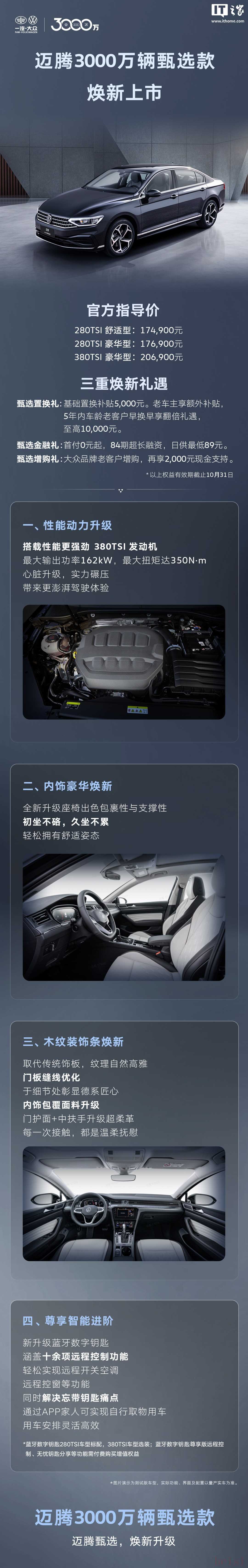 IT之家 10 月 10 日消息,一汽-大众迈腾 3000 万辆甄选款汽车今日焕新上市,官方指导价 17.49 万元起。