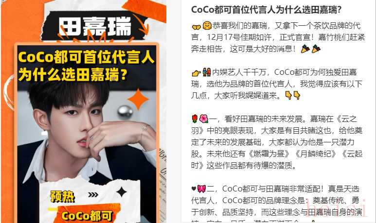 事实上,在官宣之前,就有粉丝从日常的蛛丝马迹中发现了CoCo都可与田嘉瑞的双向奔赴。在一次粉丝探班过程中,有人向田嘉瑞推荐新茶饮产品,瑞瑞回应称,“现在尽量喝CoCo都可哦~”,评论区就有粉丝说道,“这是真瓜主,一有点啥事儿都憋不住。”在田嘉瑞主演的《燃霜为昼》杀青时,CoCo都可也进行了奶茶应援,并且在12月4日田嘉瑞生日当天,CoCo都可官方微博在12点04分准点送上生日祝福。嘉竹桃们也总结出田嘉瑞与CoCo都可的契合点,阳光活力、真诚鲜活、出色演技等均与CoCo都可的品牌调性、态度及追求产品品质不谋而合。