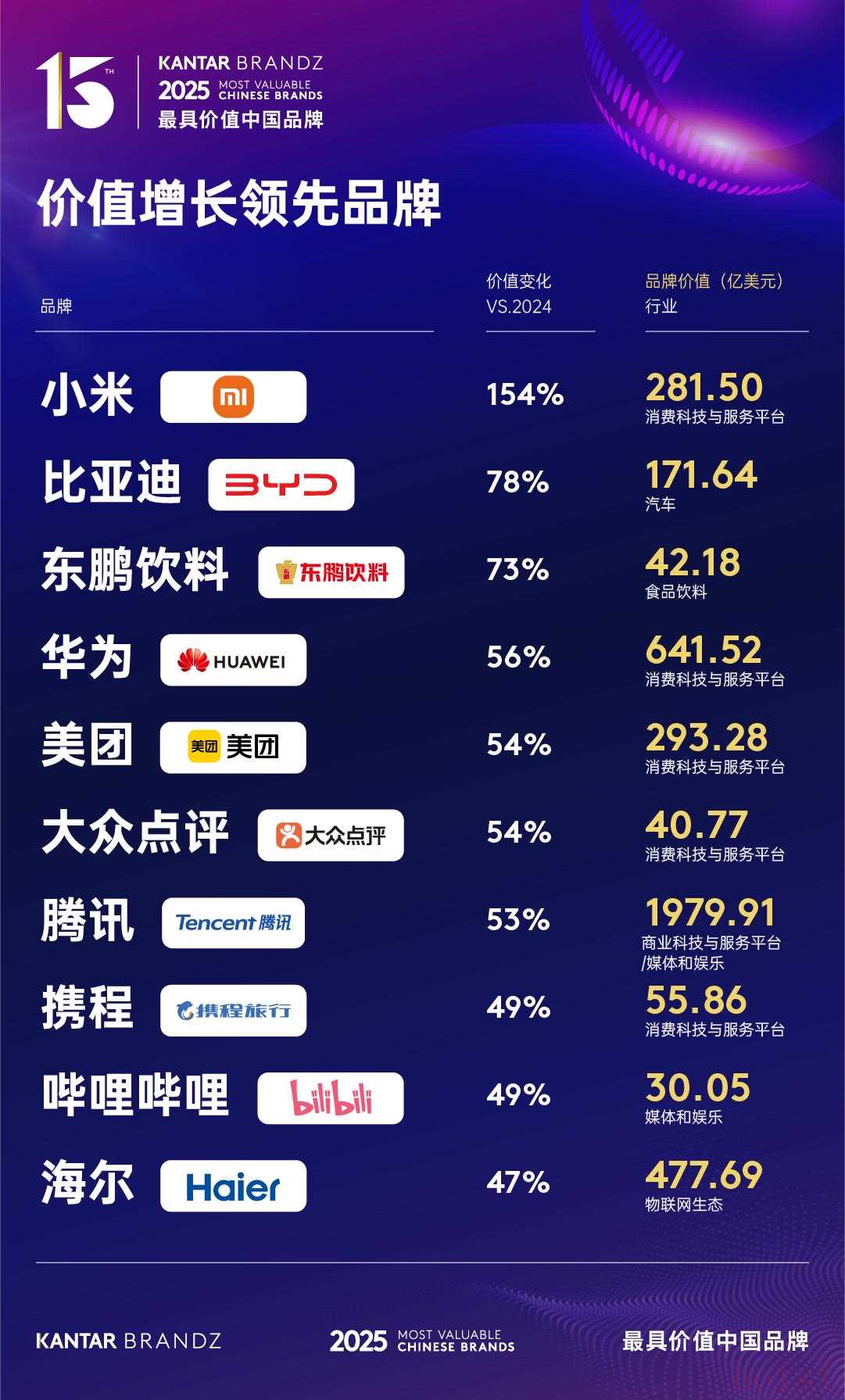 价值增长领先品牌中,小米(第 11 名,281.50 亿美元)以 154% 的惊人增速领跑榜单,比亚迪(第 18 名,171.64 亿美元)以 78% 的增幅位列增速第二。其他品牌还有东鹏饮料、华为、美团、大众点评、腾讯、携程、哔哩哔哩、海尔。