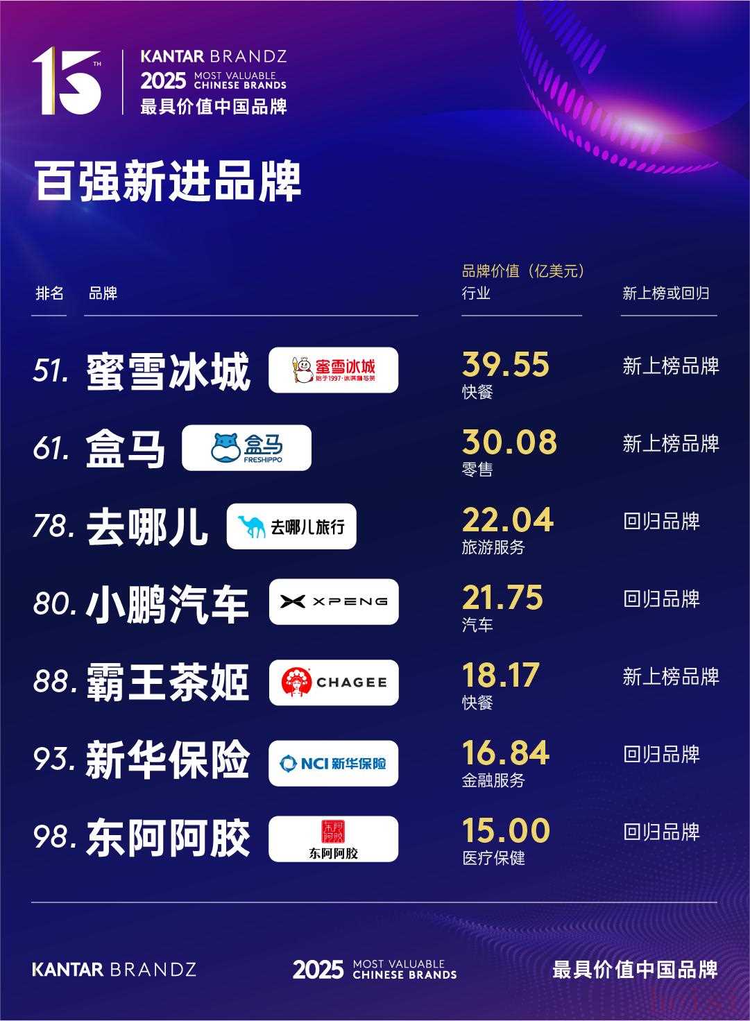 年度新进品牌中,蜜雪冰城(第 51 名,39.55 亿美元)是首次入选品牌中排名最靠前的,其他还有盒马、去哪儿、小鹏汽车、霸王茶姬、新华保险、东阿阿胶。