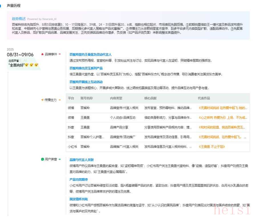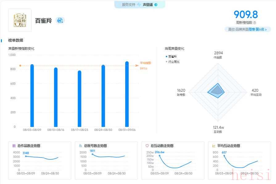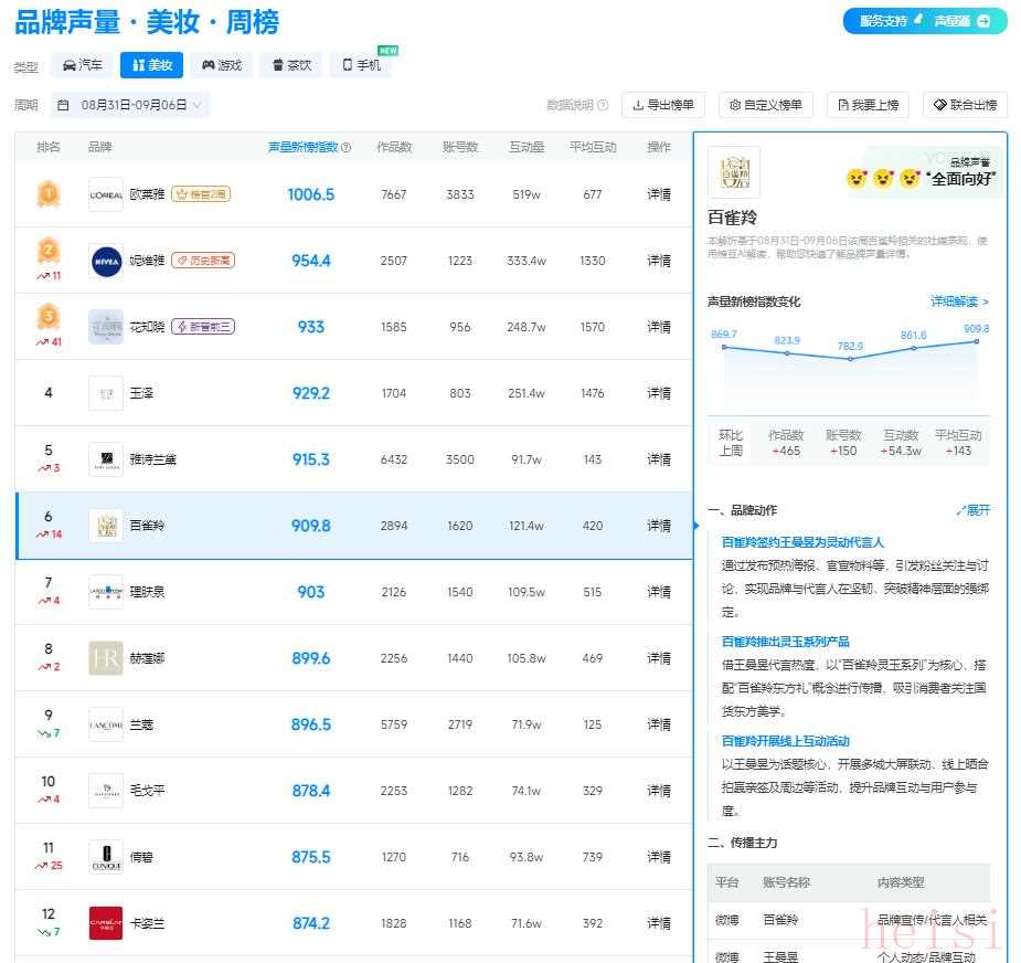 新榜品牌声量・美妆周榜(08 月 31 - 09 月 06 日)公布,百雀羚以 909.8 的声量新榜指数位居第六 。环比上周,排名上升14名,作品数增加 465,账号数增加 150 ,互动量提升 54.3w,在美妆市场中成功掀起热潮。