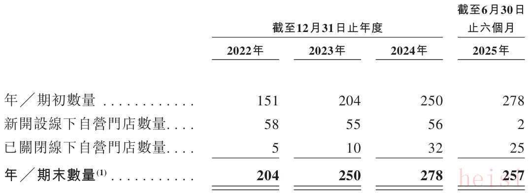 2022年、2023年、2024年及截至2025年6月30日,公司分别终止了5家、10家、32家及25家常设线下自营门店。公司称:主要反映其积极优化常设线下自营门店网络的举措,即关闭品牌呈现方式及盈利模式不符合长期发展最佳模式的门店。