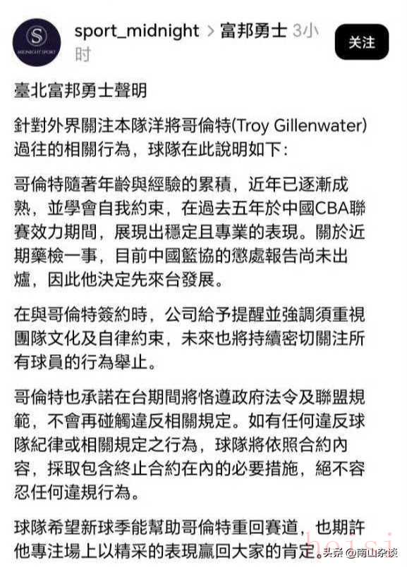最近一段时间,CBA的最新动态大多来自于外援加盟和热身赛,这也是目前各支球队工作的重心,但与此同时,一些CBA的前外援,也传出了值得大家关注的消息。首先是吉伦沃特签约台湾省联赛,台北富邦勇士俱乐部引发的争议,近日富邦勇士也正式做出了回应。另外,CBA官方正式发布公告,征集承办俱乐部杯的赛区。