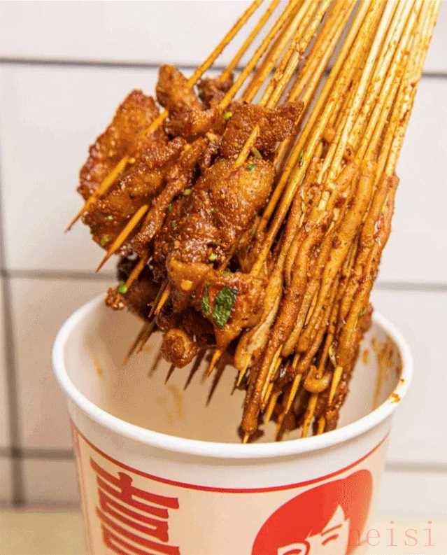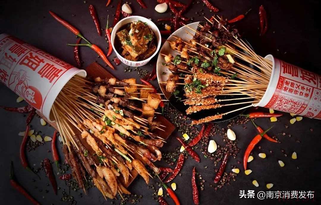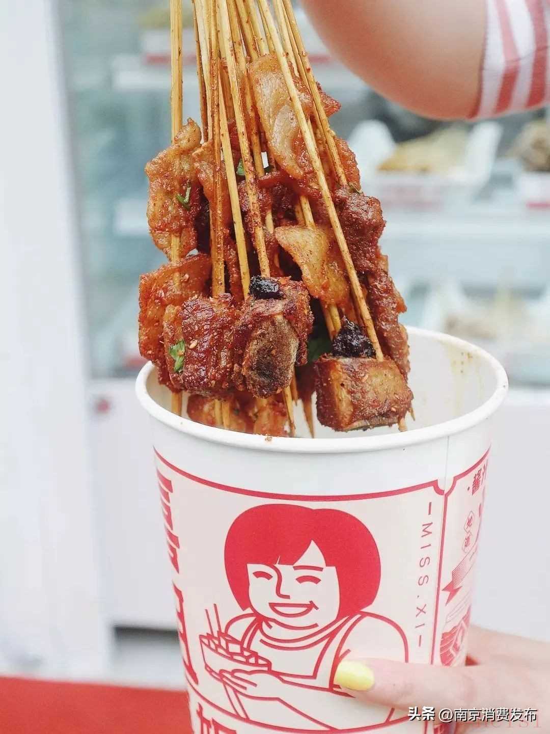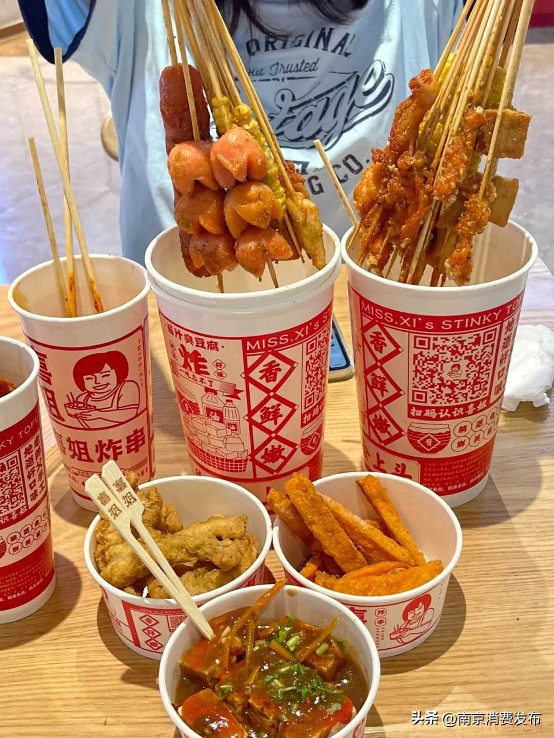 2. "喜姐炸串 (Xǐ Jiě Zhá Chuàn):" 也是南京本地非常火爆的 "炸串" 品牌。提供种类繁多的炸串,搭配秘制酱料,是南京街头小吃文化的重要组成部分,人气很高。