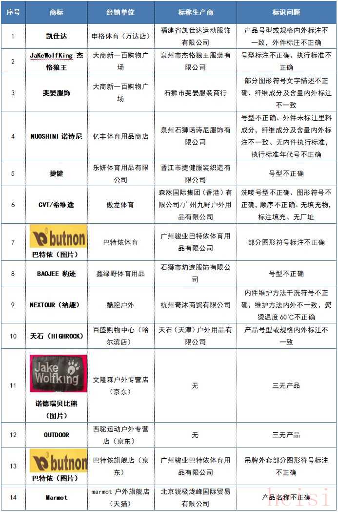 本次检测有14款样品标识不符合标准。主要问题是产品号型规格、执行标准、纤维含量、维护方法、安全类别等标注不正确,有的产品名称、厂名、厂址标注不全。