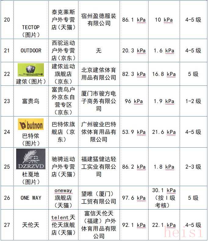 冲锋衣产品比较试验结果