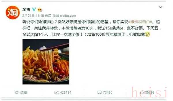 疫情期间,吃货们凭借一己之力,成功将螺蛳粉推上速食C位,#螺蛳粉还不发货#、#中国人到底有多爱吃螺蛳粉#、#吃螺蛳粉有多拼#、#6000万人呼唤螺蛳粉自由#等相关话题频繁登上微博热搜。淘宝看准了这一营销机会,2月21号,借势发起了名为#螺蛳粉自由#的锦鲤活动:即关注并转发,活动微博每转发10次,官方就会送出一份螺蛳粉,臭不封顶,拯救消费者的“螺蛳粉荒”。这场弥漫着酸臭味的活动一经发布,就引发无数网友支持和讨论,转发量42W+,评论量7W+,点赞超过8W!