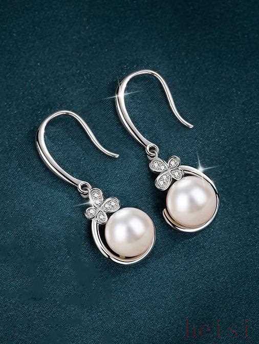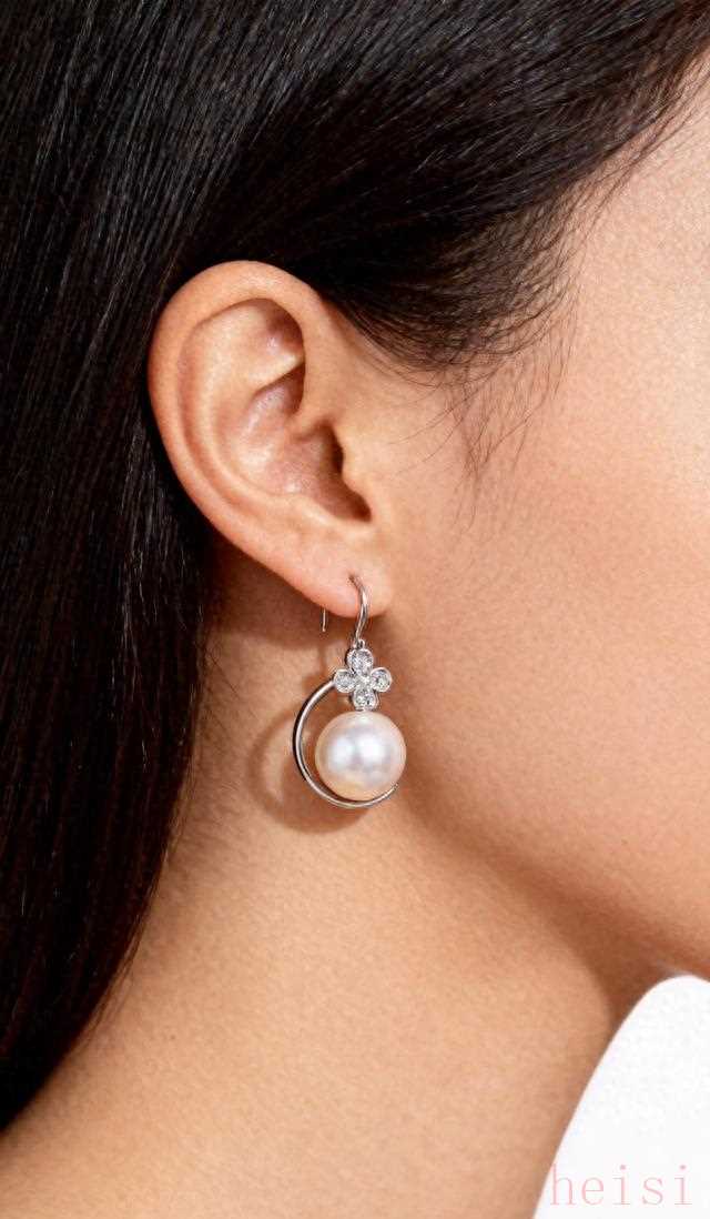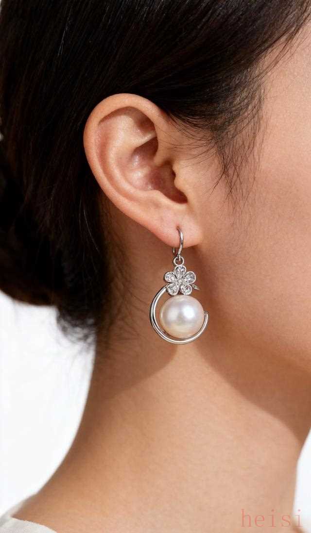 为您设计几款适合中老年女士的珍珠耳环,搭配银色金属托架和四叶草造型,强调优雅、知性与低调的精致感: