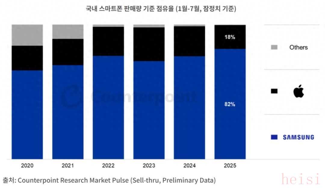 如上图所见,研究机构Counterpoint更新了2020年-2025年六年来1月-7月期间韩国智能手机销售量市场份额数据,可以看到韩国本土品牌三星在自家大本营市占率非常恐怖,2025年份额更是飙升到了82%,其次是苹果占比约18%,其他品牌近乎为0。