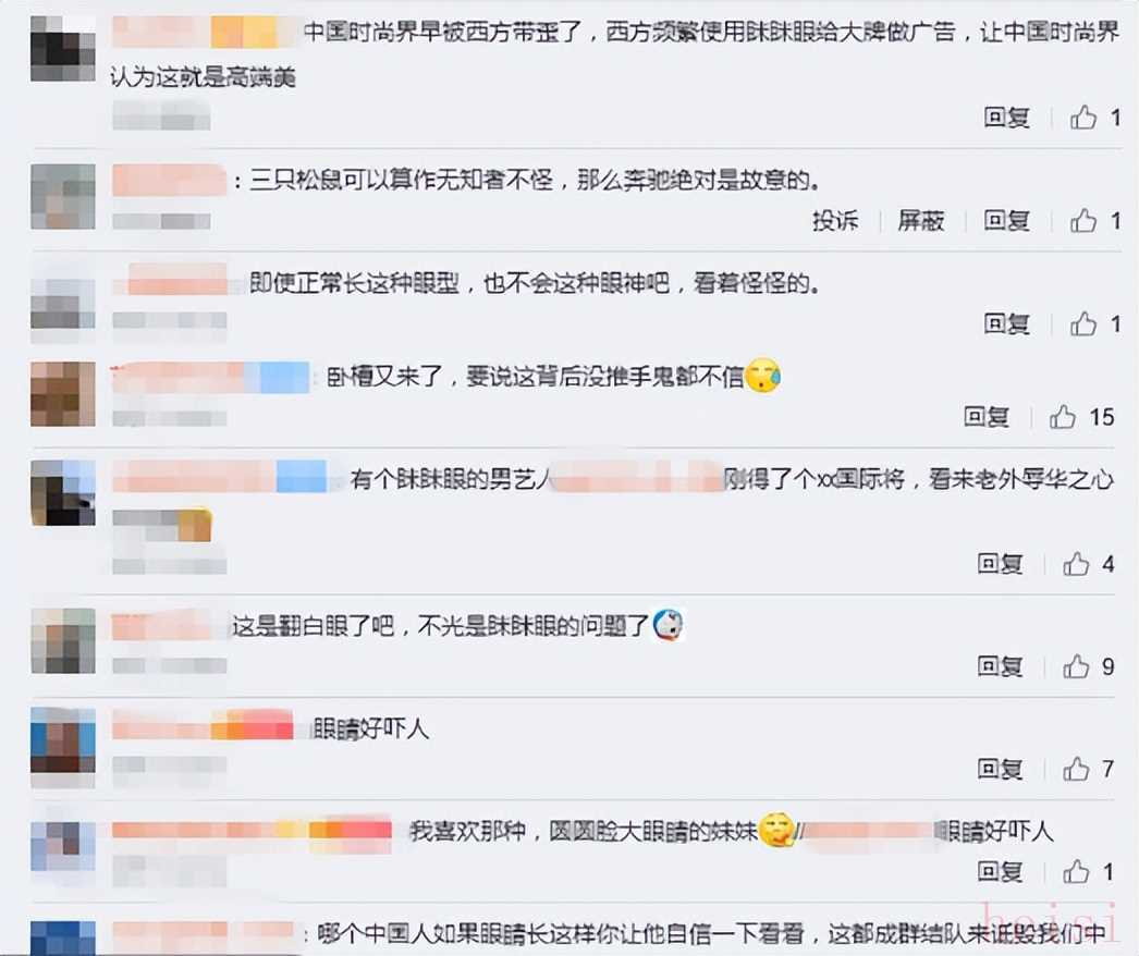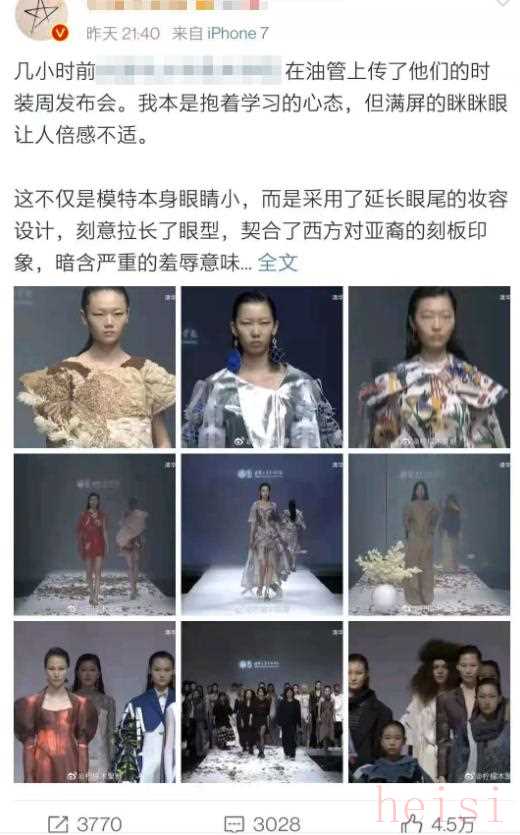 当时清华美院服装设计专业的模特,统一选取了眼睛狭长的人,还在化妆时刻意拉长眼型,引起大众的极度不适。