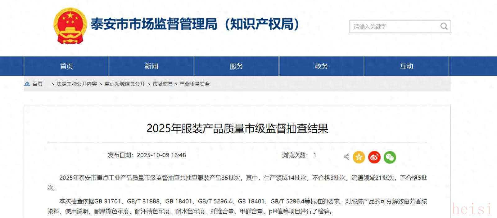 中国质量新闻网讯 近日,山东省泰安市市场监管局网站发布2025年服装产品质量市级监督抽查结果。