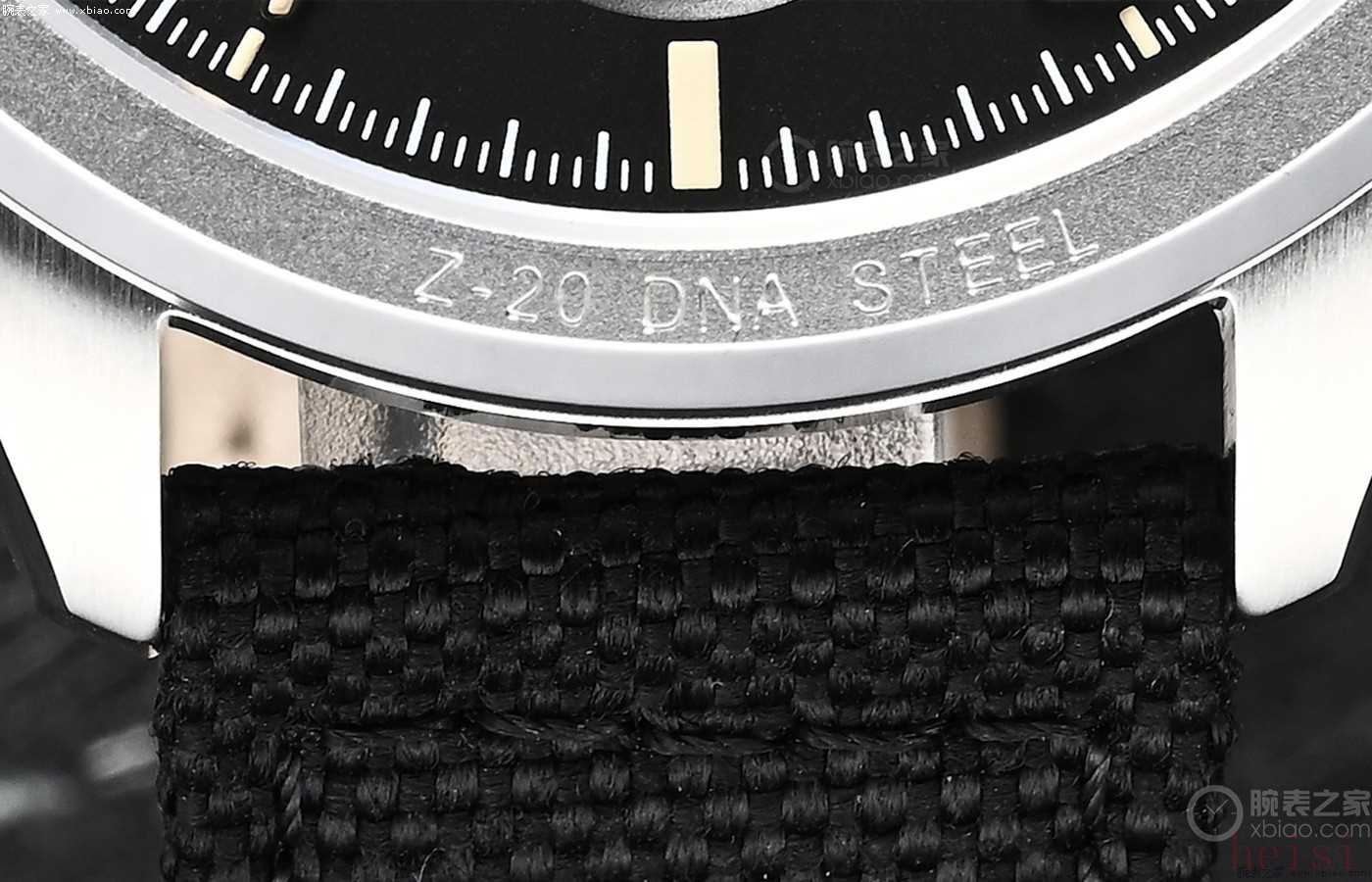 飞亚达马赫系列“直-20”制胜款腕表使用精钢材质打造,表壳直径43毫米,厚度11.1毫米,具备50米防水深度。表头经过拉丝打磨处理,呈现出细腻的质感。腕表的表圈材质比较特殊,飞亚达将“直-20”旋翼相关的特殊合金材质与钢材质结合,经过高温真空冶炼、反复提纯、多次轧制,打造出带有“直-20”基因的金属钢,用来制作表圈。这种材质韧性更强、抗变形性能好,并且上手轻盈,亲和皮肤。可以看到,表圈上有“Z-20 DNA STEEL”标识,表明这一特殊的身份。