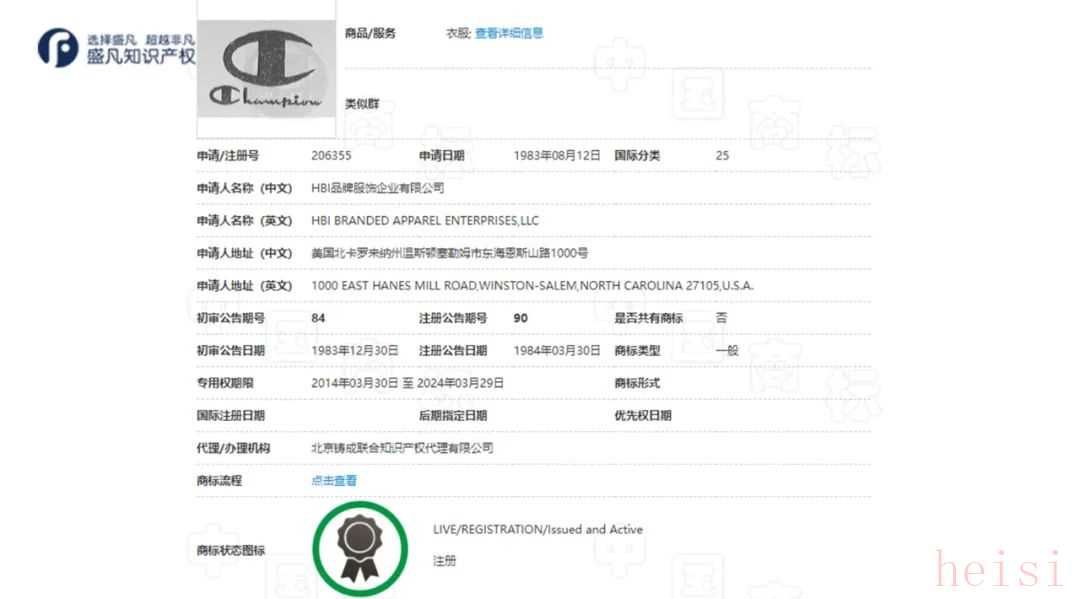在国内,Champion品牌隶属于HBI品牌服饰企业有限公司,该公司在1983年便申请了“CHAMPION”文字及图形商标,商标国际分类为25类服装鞋帽,后续又围绕“CHAMPION”注册了多个图形及品牌首字母“C”相关商标。
