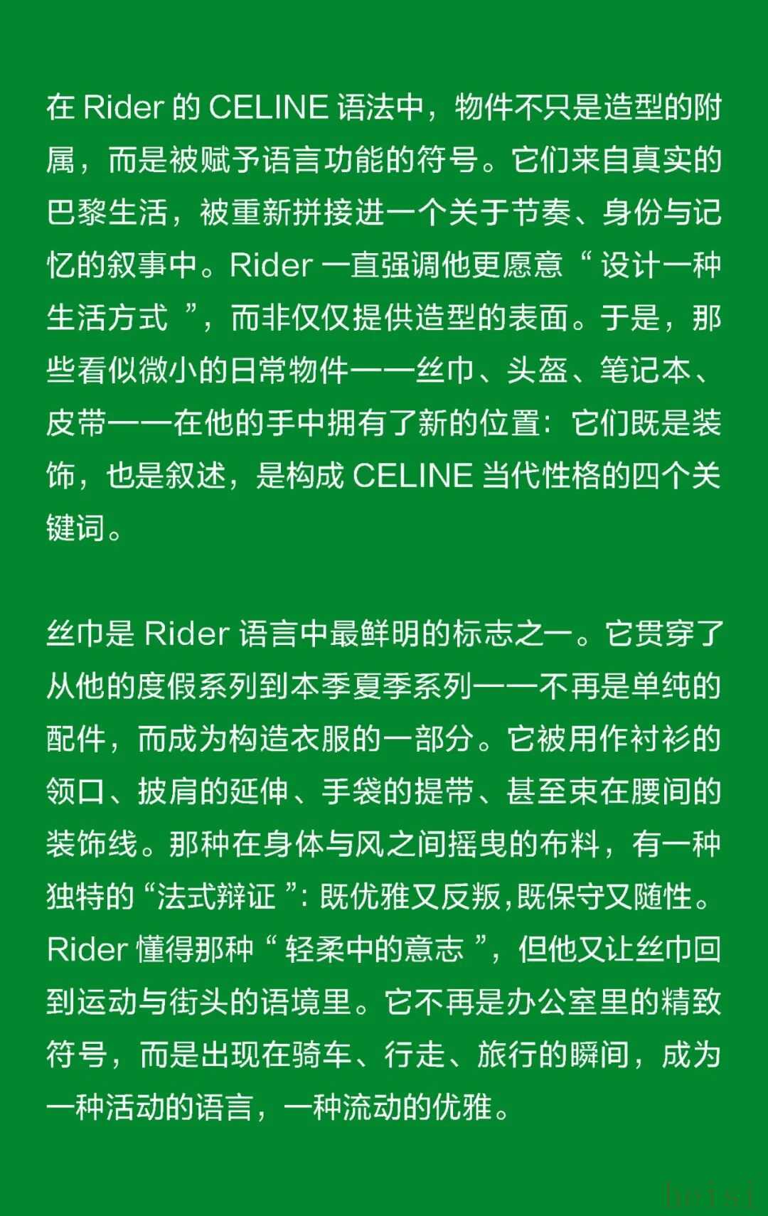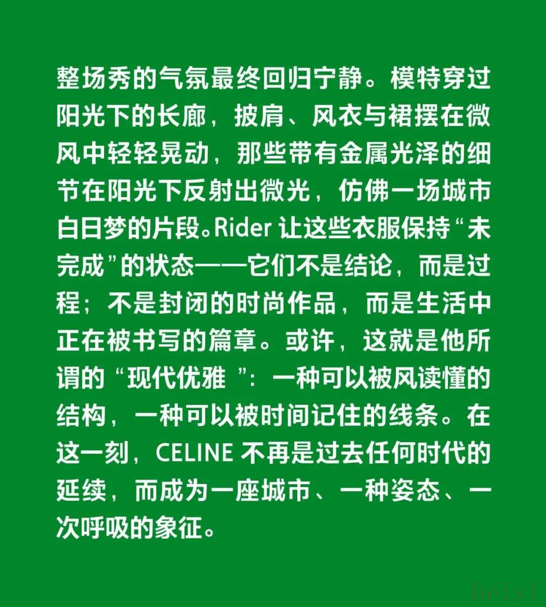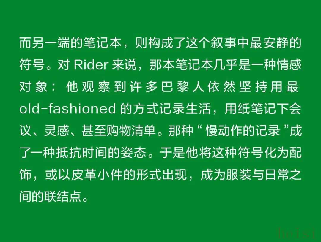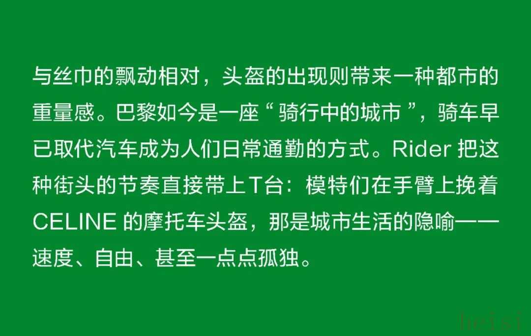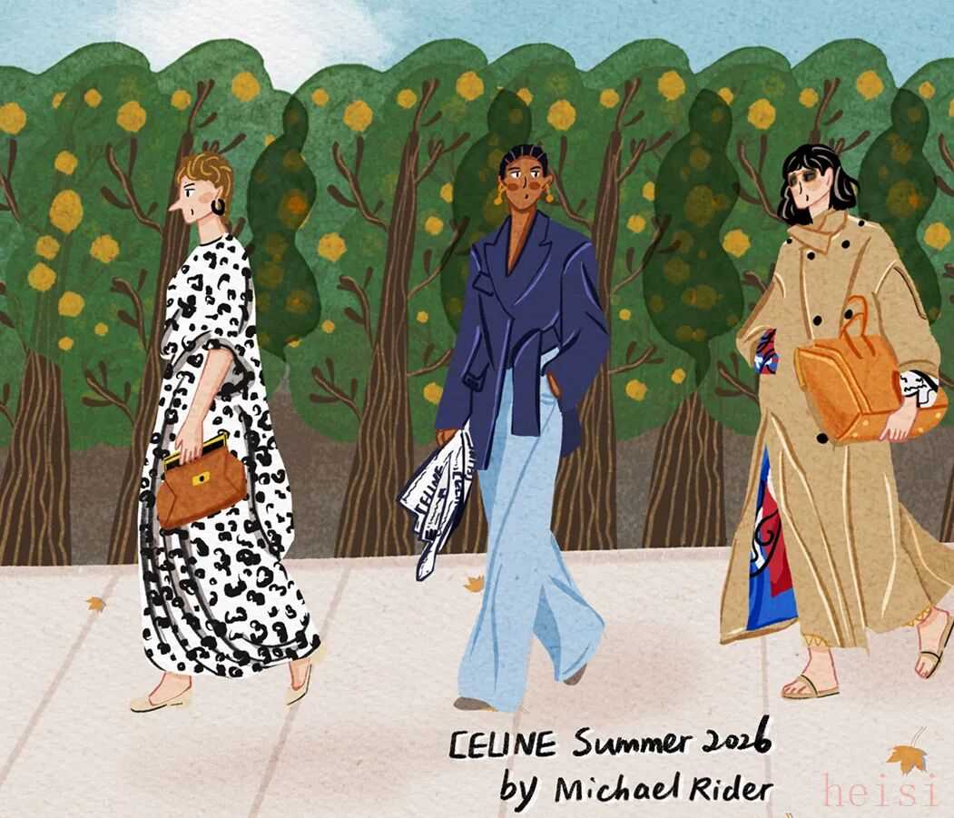 这个“最像法国人的美国人”正在刷新CELINE 在巴黎,人们总说“真正的优雅不是造出来的,而是活出来的”。Michael Rider 恰好就是那个懂得生活语法的人。作为 CELINE 新任掌舵者,他没有用激进的概念去刷新品牌,而是用一种近乎温柔的方式重写节奏:一边让风吹进剪裁里,一边让现实感进入梦境。 在Michael Rider手中,丝巾不只是配饰,是风的延长;皮带藏着地址,是一种归属的暗语;连那只带着微笑弧线的包,都像是城市里偶遇的一个眼神。Rider 让巴黎变得更轻、更慢、更真切——他不讲浪漫,却让浪漫自然发生。 他看见的巴黎女人,不在香榭丽舍大道的橱窗里,而是在街角咖啡馆抿一口意式浓缩、在春天的风里重新整理披肩的人。她们行走、转身、停顿的每一个瞬间,都是 CELINE 的语言。Rider 做的,只是把这种呼吸——那种“走着也优雅”的状态——缝进每一件衣服里。 1. 设计师身份与视角——那个最像法国人的美国人 在巴黎的 CELINE 办公室里,Michael Rider 总被同事半开玩笑地称作“那个最像法国人的美国人”。这并不是夸张的比喻——他在巴黎生活了将近二十年,说着比英语更流畅的法语,熟悉城市每一个小区的节奏:知道哪家文具店仍卖传统的烫印笔记本和墨水,也知道女人们如何在春风里将丝巾系得不经意却精准。那种带着体温的优雅、带点克制的随性,是他长期观察巴黎女性生活后积累的敏感经验。 Rider 的设计不是模仿巴黎,而是对这座城市生活方式的再现。他并不以游客或外来者的眼光去看,而是以一个在地生活者的耐心去捕捉那些微小却决定性的细节——女人踩着高跟鞋在 Café 门口吸着香烟、清晨骑车去上班的年轻人随意披着一件 Oversize 西装外套、手里夹着文件和咖啡杯匆匆穿街。这些场景并非浪漫化的巴黎,而是真实的日常——而 Rider 所做的,就是把这种真实,转化为可以穿在身上的语法。 Rider 的“法国性”并非来自刻意营造的文化标签,而是一种在生活中自然浸润的感知经验。早年在 Phoebe Philo 领导的团队中工作多年,他由此习得了对结构与比例的高度敏感,也体会到真正的优雅,往往存在于“理性中带一丝犹疑”的瞬间——那种精确与模糊并存的节奏,成为他设计语言的底色。Rider 的思维方式恰好游走于美国的清晰与法国的暧昧之间:他既懂得如何编辑、归纳,也懂得如何留白与含蓄。 这种双重气质在 2026 夏季系列中被呈现得格外自然——Rider 并未以宏大的概念去重塑 CELINE,而是让品牌在日常的语境中自由呼吸。你能从秀场上感受到他对巴黎女性的细腻观察:那并非刻意营造的“造型感”,而是一种关于节奏的叙事——关于人在城市中的行走、停顿与驻足。 他常说自己并不刻意去区分“美国”或“法国”的设计方式。他的训练背景当然带着美式的清晰与功能性——那是一种对结构、比例和效率的敏感;但他在巴黎的这些年,让他学会了另一种节奏:对生活的耐心、对细节的温度,以及对不完美的包容。也正因如此,他在面对 CELINE 这个充满历史张力的品牌时,能以一种柔和的态度去调和其内部的多重传统。 Philo 的时代代表着理性的女性思考,Hedi Slimane 的篇章则书写了青年锐度与夜色中的孤傲,而 Rider 并未选择任何一方。他站在两者之间,以克制而平衡的语调,重新组织了 CELINE 的语言系统。他保留了前者那种与身体同频的优雅,也继承了后者的线条感与锋芒,只是将两者的节奏都放缓,使之更具从容与温度。 Rider 所理解的巴黎,是有温度也有灰尘的。它不在舞台灯光下闪烁,而是在日常的重复中被不断定义——在通勤、午餐、散步的过程中,那些看似平凡的举动,构成了风格的真实来源。他的 CELINE 亦如此:不是被观赏的对象,而是可以被生活摩擦、被时间磨亮的衣服。那种介于理性与感性、精确与松弛之间的平衡,正是他作为“最像法国人的美国人”所赋予品牌的独特语气。 2. 符号的重构——丝巾、头盔、笔记本与皮带 在 Rider 的 CELINE 语法中,物件不只是造型的附属,而是被赋予语言功能的符号。它们来自真实的巴黎生活,被重新拼接进一个关于节奏、身份与记忆的叙事中。Rider 一直强调他更愿意“设计一种生活方式”,而非仅仅提供造型的表面。于是,那些看似微小的日常物件——丝巾、头盔、笔记本、皮带——在他的手中拥有了新的位置:它们既是装饰,也是叙述,是构成 CELINE 当代性格的四个关键词。 丝巾是 Rider 语言中最鲜明的标志之一。它贯穿了从他的度假系列到本季夏季系列——不再是单纯的配件,而成为构造衣服的一部分。它被用作衬衫的领口、披肩的延伸、手袋的提带、甚至束在腰间的装饰线。那种在身体与风之间摇曳的布料,有一种独特的“法式辩证”:既优雅又反叛,既保守又随性。Rider 懂得那种“轻柔中的意志”,但他又让丝巾回到运动与街头的语境里。它不再是办公室里的精致符号,而是出现在骑车、行走、旅行的瞬间,成为一种活动的语言,一种流动的优雅。 与丝巾的飘动相对,头盔的出现则带来一种都市的重量感。巴黎如今是一座“骑行中的城市”,骑车早已取代汽车成为人们日常通勤的方式。Rider 把这种街头的节奏直接带上 T 台:模特们在手臂上挽着 CELINE 的摩托车头盔,那是城市生活的隐喻——速度、自由、甚至一点点孤独。 而另一端的笔记本,则构成了这个叙事中最安静的符号。对 Rider 来说,那本