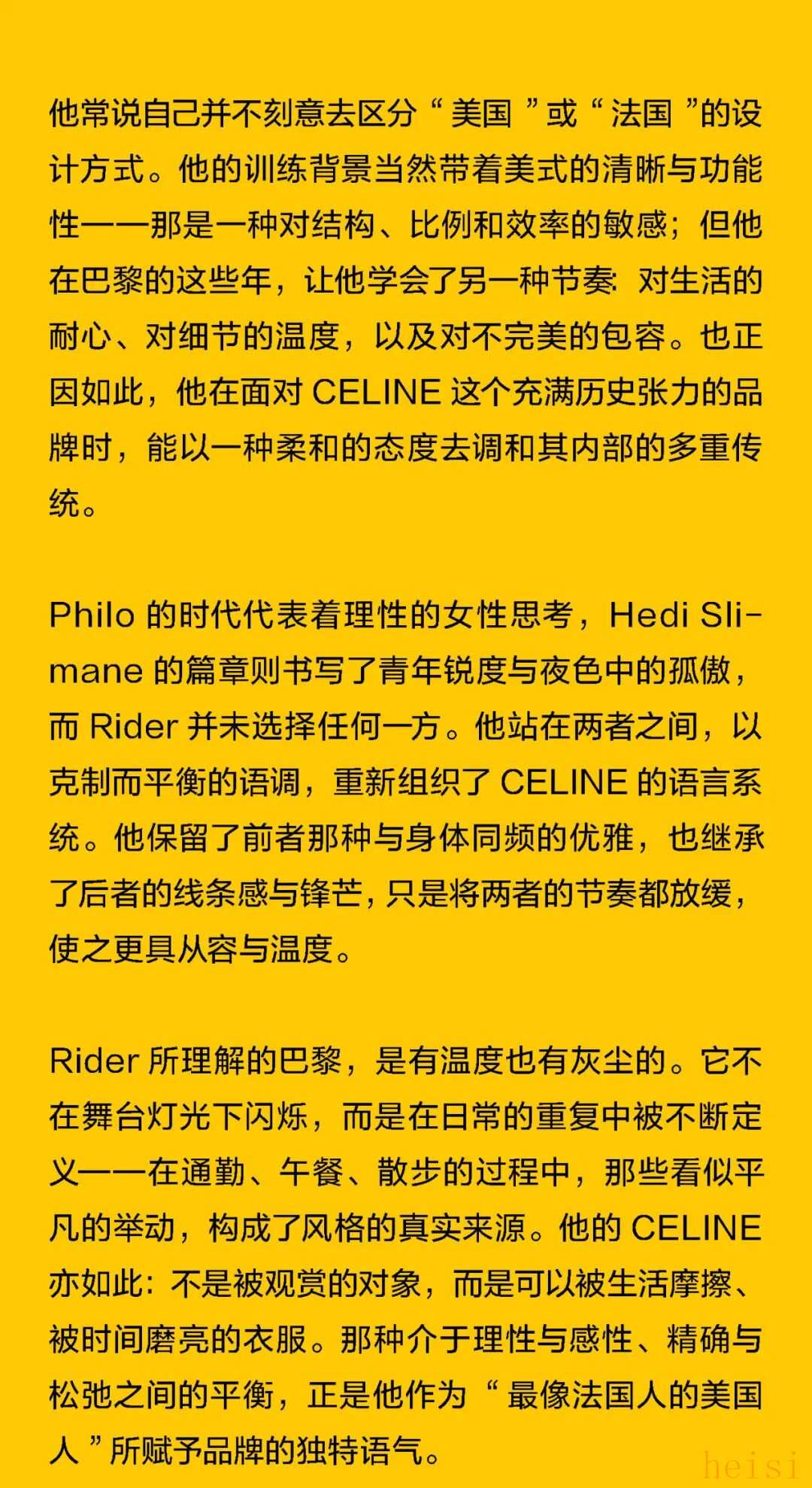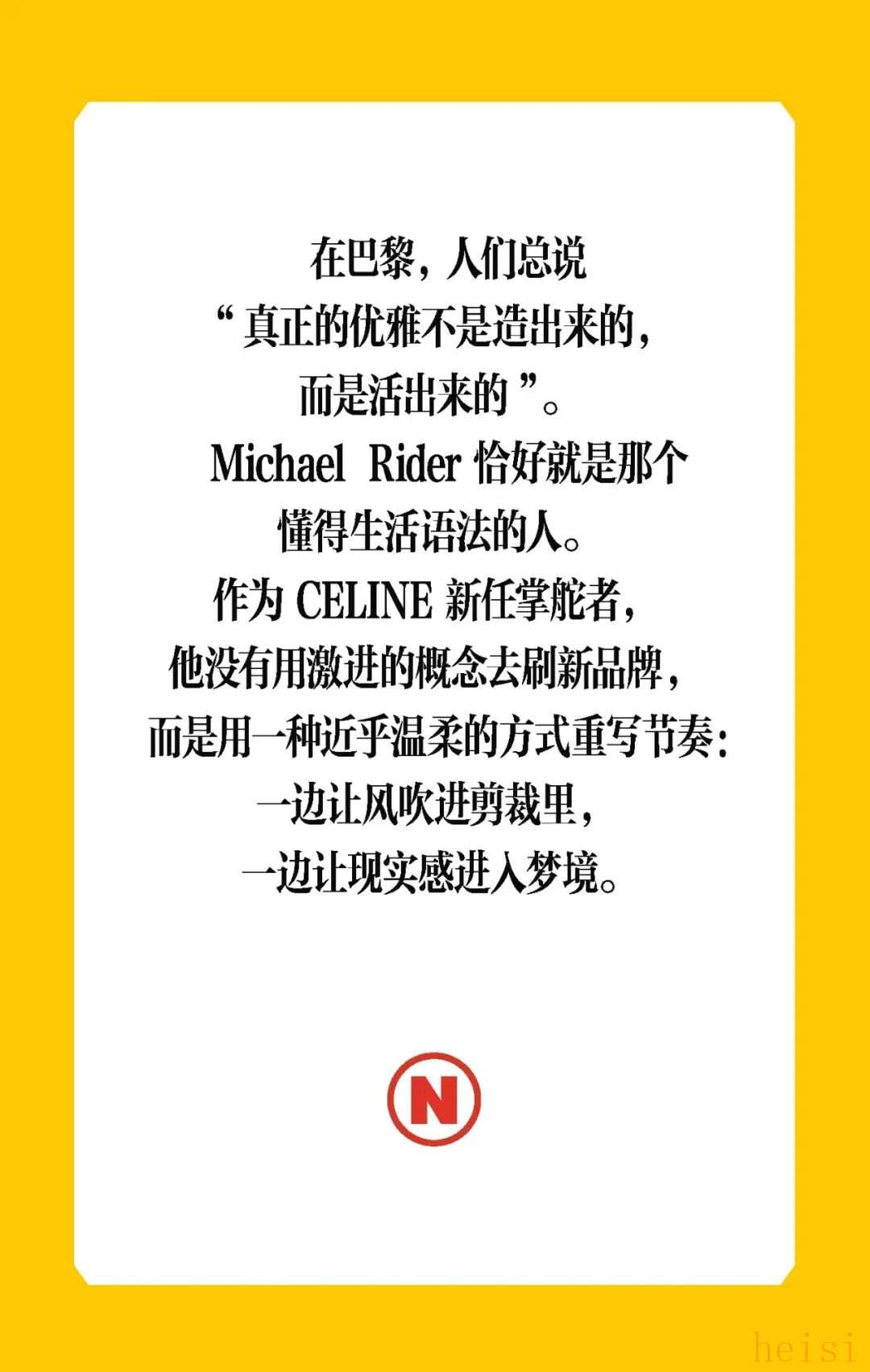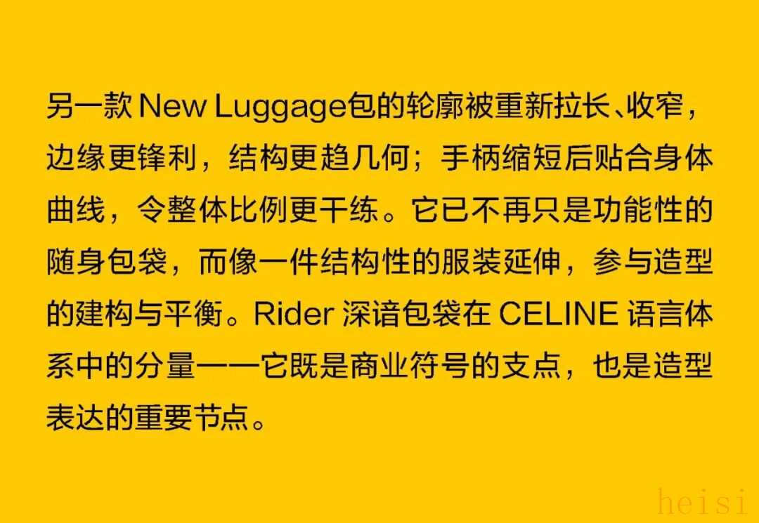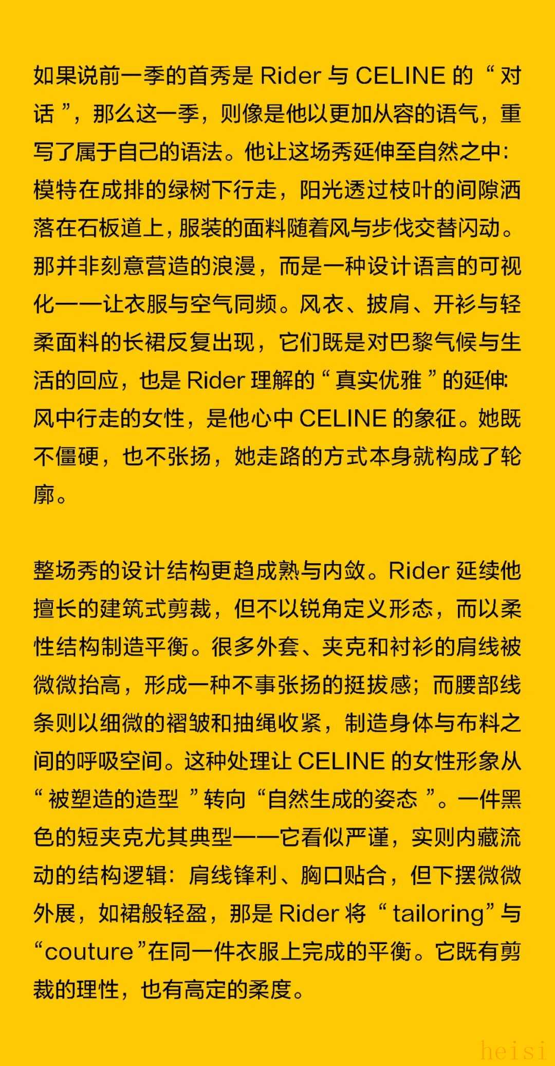 这个“最像法国人的美国人”正在刷新CELINE 在巴黎,人们总说“真正的优雅不是造出来的,而是活出来的”。Michael Rider 恰好就是那个懂得生活语法的人。作为 CELINE 新任掌舵者,他没有用激进的概念去刷新品牌,而是用一种近乎温柔的方式重写节奏:一边让风吹进剪裁里,一边让现实感进入梦境。 在Michael Rider手中,丝巾不只是配饰,是风的延长;皮带藏着地址,是一种归属的暗语;连那只带着微笑弧线的包,都像是城市里偶遇的一个眼神。Rider 让巴黎变得更轻、更慢、更真切——他不讲浪漫,却让浪漫自然发生。 他看见的巴黎女人,不在香榭丽舍大道的橱窗里,而是在街角咖啡馆抿一口意式浓缩、在春天的风里重新整理披肩的人。她们行走、转身、停顿的每一个瞬间,都是 CELINE 的语言。Rider 做的,只是把这种呼吸——那种“走着也优雅”的状态——缝进每一件衣服里。 1. 设计师身份与视角——那个最像法国人的美国人 在巴黎的 CELINE 办公室里,Michael Rider 总被同事半开玩笑地称作“那个最像法国人的美国人”。这并不是夸张的比喻——他在巴黎生活了将近二十年,说着比英语更流畅的法语,熟悉城市每一个小区的节奏:知道哪家文具店仍卖传统的烫印笔记本和墨水,也知道女人们如何在春风里将丝巾系得不经意却精准。那种带着体温的优雅、带点克制的随性,是他长期观察巴黎女性生活后积累的敏感经验。 Rider 的设计不是模仿巴黎,而是对这座城市生活方式的再现。他并不以游客或外来者的眼光去看,而是以一个在地生活者的耐心去捕捉那些微小却决定性的细节——女人踩着高跟鞋在 Café 门口吸着香烟、清晨骑车去上班的年轻人随意披着一件 Oversize 西装外套、手里夹着文件和咖啡杯匆匆穿街。这些场景并非浪漫化的巴黎,而是真实的日常——而 Rider 所做的,就是把这种真实,转化为可以穿在身上的语法。 Rider 的“法国性”并非来自刻意营造的文化标签,而是一种在生活中自然浸润的感知经验。早年在 Phoebe Philo 领导的团队中工作多年,他由此习得了对结构与比例的高度敏感,也体会到真正的优雅,往往存在于“理性中带一丝犹疑”的瞬间——那种精确与模糊并存的节奏,成为他设计语言的底色。Rider 的思维方式恰好游走于美国的清晰与法国的暧昧之间:他既懂得如何编辑、归纳,也懂得如何留白与含蓄。 这种双重气质在 2026 夏季系列中被呈现得格外自然——Rider 并未以宏大的概念去重塑 CELINE,而是让品牌在日常的语境中自由呼吸。你能从秀场上感受到他对巴黎女性的细腻观察:那并非刻意营造的“造型感”,而是一种关于节奏的叙事——关于人在城市中的行走、停顿与驻足。 他常说自己并不刻意去区分“美国”或“法国”的设计方式。他的训练背景当然带着美式的清晰与功能性——那是一种对结构、比例和效率的敏感;但他在巴黎的这些年,让他学会了另一种节奏:对生活的耐心、对细节的温度,以及对不完美的包容。也正因如此,他在面对 CELINE 这个充满历史张力的品牌时,能以一种柔和的态度去调和其内部的多重传统。 Philo 的时代代表着理性的女性思考,Hedi Slimane 的篇章则书写了青年锐度与夜色中的孤傲,而 Rider 并未选择任何一方。他站在两者之间,以克制而平衡的语调,重新组织了 CELINE 的语言系统。他保留了前者那种与身体同频的优雅,也继承了后者的线条感与锋芒,只是将两者的节奏都放缓,使之更具从容与温度。 Rider 所理解的巴黎,是有温度也有灰尘的。它不在舞台灯光下闪烁,而是在日常的重复中被不断定义——在通勤、午餐、散步的过程中,那些看似平凡的举动,构成了风格的真实来源。他的 CELINE 亦如此:不是被观赏的对象,而是可以被生活摩擦、被时间磨亮的衣服。那种介于理性与感性、精确与松弛之间的平衡,正是他作为“最像法国人的美国人”所赋予品牌的独特语气。 2. 符号的重构——丝巾、头盔、笔记本与皮带 在 Rider 的 CELINE 语法中,物件不只是造型的附属,而是被赋予语言功能的符号。它们来自真实的巴黎生活,被重新拼接进一个关于节奏、身份与记忆的叙事中。Rider 一直强调他更愿意“设计一种生活方式”,而非仅仅提供造型的表面。于是,那些看似微小的日常物件——丝巾、头盔、笔记本、皮带——在他的手中拥有了新的位置:它们既是装饰,也是叙述,是构成 CELINE 当代性格的四个关键词。 丝巾是 Rider 语言中最鲜明的标志之一。它贯穿了从他的度假系列到本季夏季系列——不再是单纯的配件,而成为构造衣服的一部分。它被用作衬衫的领口、披肩的延伸、手袋的提带、甚至束在腰间的装饰线。那种在身体与风之间摇曳的布料,有一种独特的“法式辩证”:既优雅又反叛,既保守又随性。Rider 懂得那种“轻柔中的意志”,但他又让丝巾回到运动与街头的语境里。它不再是办公室里的精致符号,而是出现在骑车、行走、旅行的瞬间,成为一种活动的语言,一种流动的优雅。 与丝巾的飘动相对,头盔的出现则带来一种都市的重量感。巴黎如今是一座“骑行中的城市”,骑车早已取代汽车成为人们日常通勤的方式。Rider 把这种街头的节奏直接带上 T 台:模特们在手臂上挽着 CELINE 的摩托车头盔,那是城市生活的隐喻——速度、自由、甚至一点点孤独。 而另一端的笔记本,则构成了这个叙事中最安静的符号。对 Rider 来说,那本