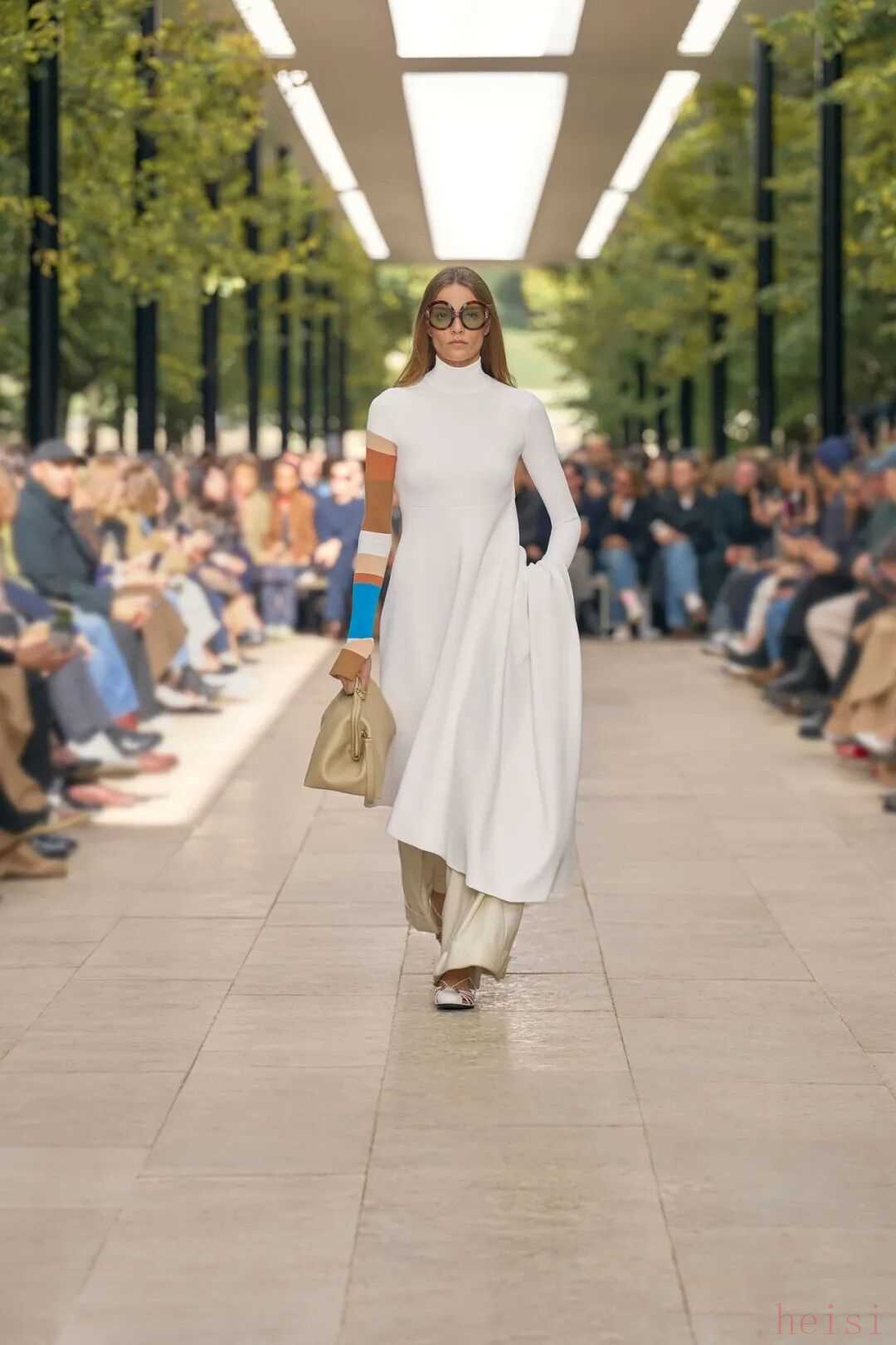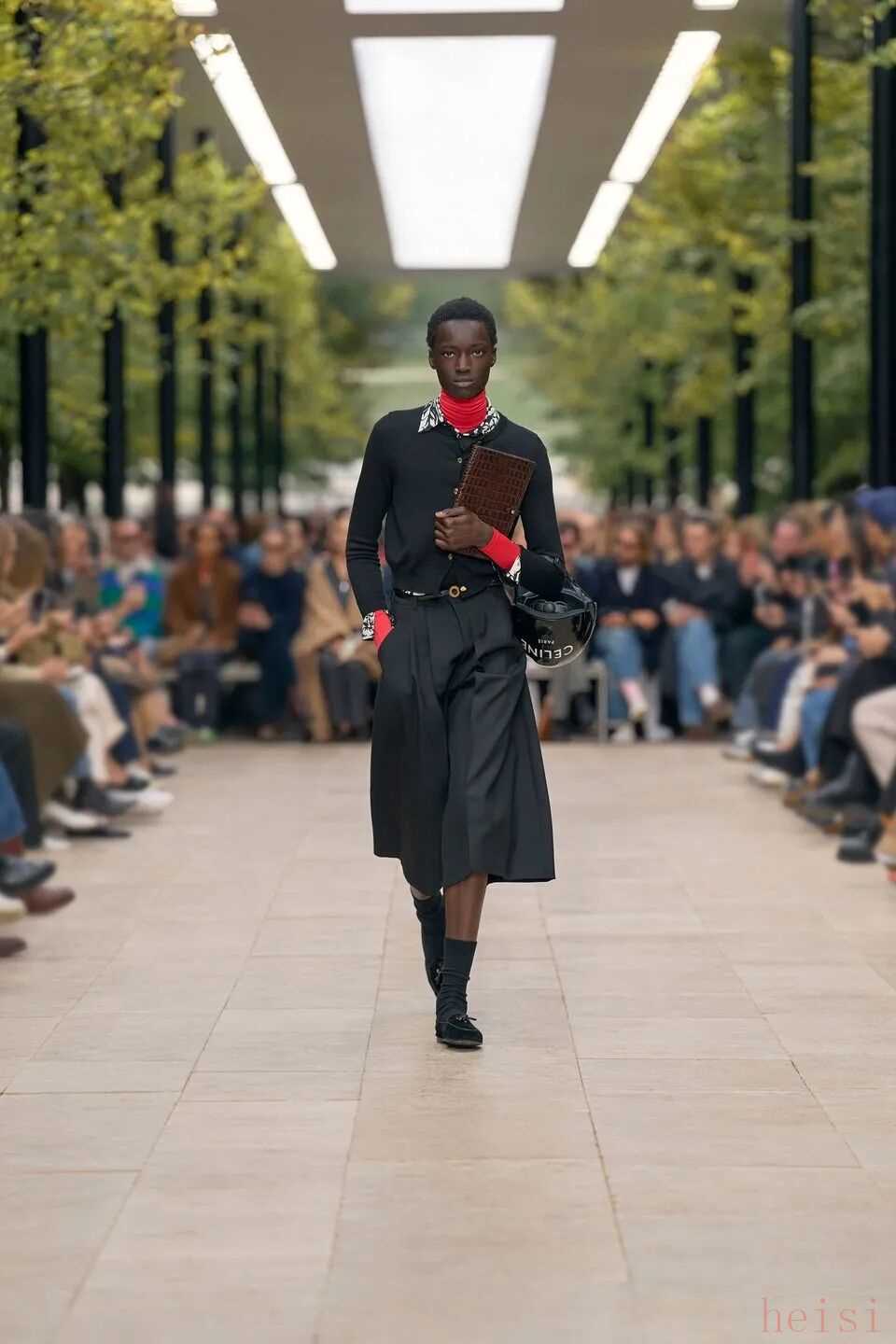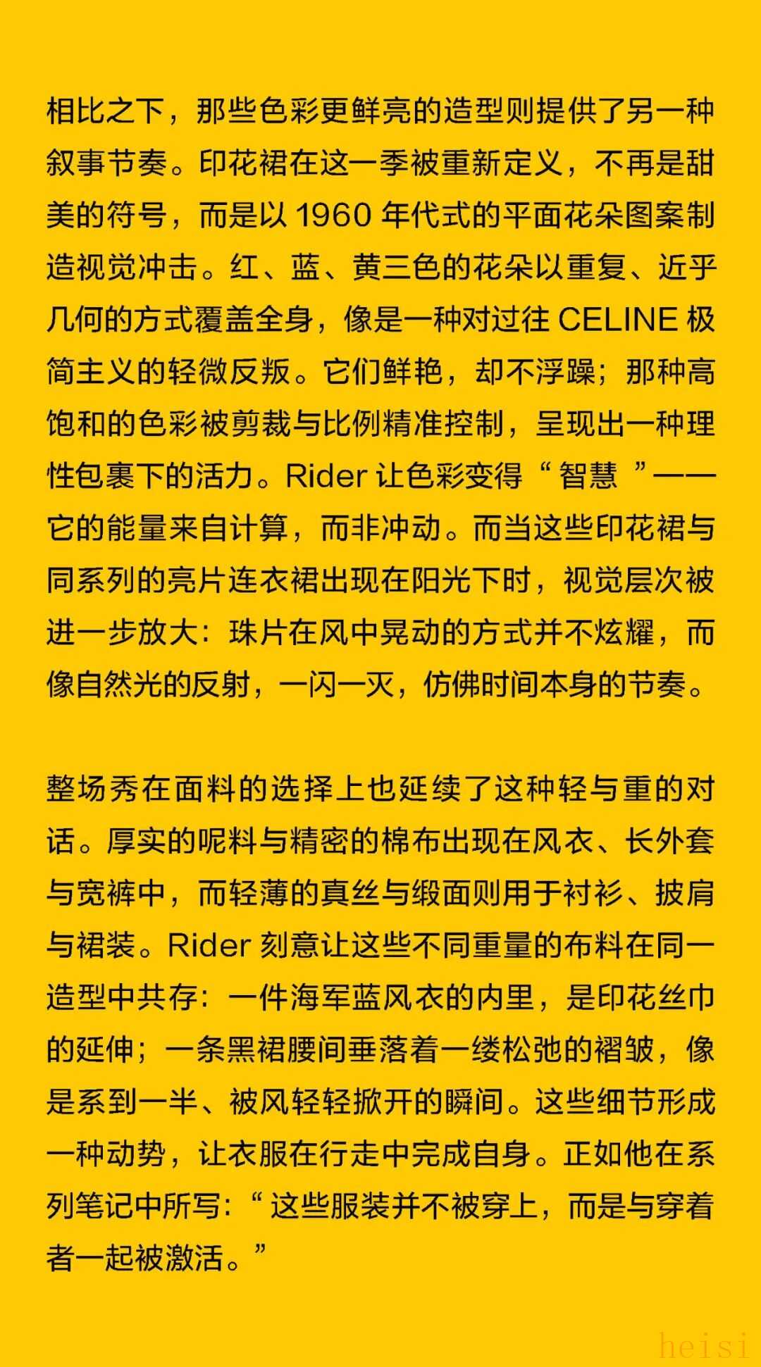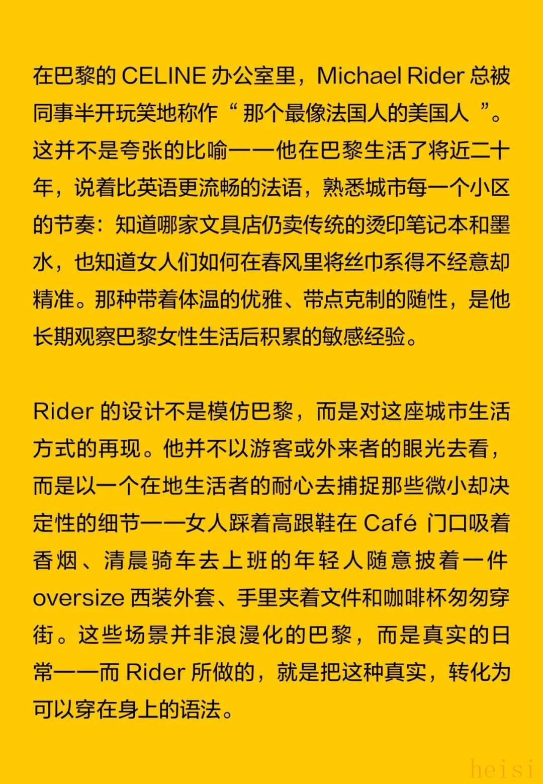 这个“最像法国人的美国人”正在刷新CELINE 在巴黎,人们总说“真正的优雅不是造出来的,而是活出来的”。Michael Rider 恰好就是那个懂得生活语法的人。作为 CELINE 新任掌舵者,他没有用激进的概念去刷新品牌,而是用一种近乎温柔的方式重写节奏:一边让风吹进剪裁里,一边让现实感进入梦境。 在Michael Rider手中,丝巾不只是配饰,是风的延长;皮带藏着地址,是一种归属的暗语;连那只带着微笑弧线的包,都像是城市里偶遇的一个眼神。Rider 让巴黎变得更轻、更慢、更真切——他不讲浪漫,却让浪漫自然发生。 他看见的巴黎女人,不在香榭丽舍大道的橱窗里,而是在街角咖啡馆抿一口意式浓缩、在春天的风里重新整理披肩的人。她们行走、转身、停顿的每一个瞬间,都是 CELINE 的语言。Rider 做的,只是把这种呼吸——那种“走着也优雅”的状态——缝进每一件衣服里。 1. 设计师身份与视角——那个最像法国人的美国人 在巴黎的 CELINE 办公室里,Michael Rider 总被同事半开玩笑地称作“那个最像法国人的美国人”。这并不是夸张的比喻——他在巴黎生活了将近二十年,说着比英语更流畅的法语,熟悉城市每一个小区的节奏:知道哪家文具店仍卖传统的烫印笔记本和墨水,也知道女人们如何在春风里将丝巾系得不经意却精准。那种带着体温的优雅、带点克制的随性,是他长期观察巴黎女性生活后积累的敏感经验。 Rider 的设计不是模仿巴黎,而是对这座城市生活方式的再现。他并不以游客或外来者的眼光去看,而是以一个在地生活者的耐心去捕捉那些微小却决定性的细节——女人踩着高跟鞋在 Café 门口吸着香烟、清晨骑车去上班的年轻人随意披着一件 Oversize 西装外套、手里夹着文件和咖啡杯匆匆穿街。这些场景并非浪漫化的巴黎,而是真实的日常——而 Rider 所做的,就是把这种真实,转化为可以穿在身上的语法。 Rider 的“法国性”并非来自刻意营造的文化标签,而是一种在生活中自然浸润的感知经验。早年在 Phoebe Philo 领导的团队中工作多年,他由此习得了对结构与比例的高度敏感,也体会到真正的优雅,往往存在于“理性中带一丝犹疑”的瞬间——那种精确与模糊并存的节奏,成为他设计语言的底色。Rider 的思维方式恰好游走于美国的清晰与法国的暧昧之间:他既懂得如何编辑、归纳,也懂得如何留白与含蓄。 这种双重气质在 2026 夏季系列中被呈现得格外自然——Rider 并未以宏大的概念去重塑 CELINE,而是让品牌在日常的语境中自由呼吸。你能从秀场上感受到他对巴黎女性的细腻观察:那并非刻意营造的“造型感”,而是一种关于节奏的叙事——关于人在城市中的行走、停顿与驻足。 他常说自己并不刻意去区分“美国”或“法国”的设计方式。他的训练背景当然带着美式的清晰与功能性——那是一种对结构、比例和效率的敏感;但他在巴黎的这些年,让他学会了另一种节奏:对生活的耐心、对细节的温度,以及对不完美的包容。也正因如此,他在面对 CELINE 这个充满历史张力的品牌时,能以一种柔和的态度去调和其内部的多重传统。 Philo 的时代代表着理性的女性思考,Hedi Slimane 的篇章则书写了青年锐度与夜色中的孤傲,而 Rider 并未选择任何一方。他站在两者之间,以克制而平衡的语调,重新组织了 CELINE 的语言系统。他保留了前者那种与身体同频的优雅,也继承了后者的线条感与锋芒,只是将两者的节奏都放缓,使之更具从容与温度。 Rider 所理解的巴黎,是有温度也有灰尘的。它不在舞台灯光下闪烁,而是在日常的重复中被不断定义——在通勤、午餐、散步的过程中,那些看似平凡的举动,构成了风格的真实来源。他的 CELINE 亦如此:不是被观赏的对象,而是可以被生活摩擦、被时间磨亮的衣服。那种介于理性与感性、精确与松弛之间的平衡,正是他作为“最像法国人的美国人”所赋予品牌的独特语气。 2. 符号的重构——丝巾、头盔、笔记本与皮带 在 Rider 的 CELINE 语法中,物件不只是造型的附属,而是被赋予语言功能的符号。它们来自真实的巴黎生活,被重新拼接进一个关于节奏、身份与记忆的叙事中。Rider 一直强调他更愿意“设计一种生活方式”,而非仅仅提供造型的表面。于是,那些看似微小的日常物件——丝巾、头盔、笔记本、皮带——在他的手中拥有了新的位置:它们既是装饰,也是叙述,是构成 CELINE 当代性格的四个关键词。 丝巾是 Rider 语言中最鲜明的标志之一。它贯穿了从他的度假系列到本季夏季系列——不再是单纯的配件,而成为构造衣服的一部分。它被用作衬衫的领口、披肩的延伸、手袋的提带、甚至束在腰间的装饰线。那种在身体与风之间摇曳的布料,有一种独特的“法式辩证”:既优雅又反叛,既保守又随性。Rider 懂得那种“轻柔中的意志”,但他又让丝巾回到运动与街头的语境里。它不再是办公室里的精致符号,而是出现在骑车、行走、旅行的瞬间,成为一种活动的语言,一种流动的优雅。 与丝巾的飘动相对,头盔的出现则带来一种都市的重量感。巴黎如今是一座“骑行中的城市”,骑车早已取代汽车成为人们日常通勤的方式。Rider 把这种街头的节奏直接带上 T 台:模特们在手臂上挽着 CELINE 的摩托车头盔,那是城市生活的隐喻——速度、自由、甚至一点点孤独。 而另一端的笔记本,则构成了这个叙事中最安静的符号。对 Rider 来说,那本