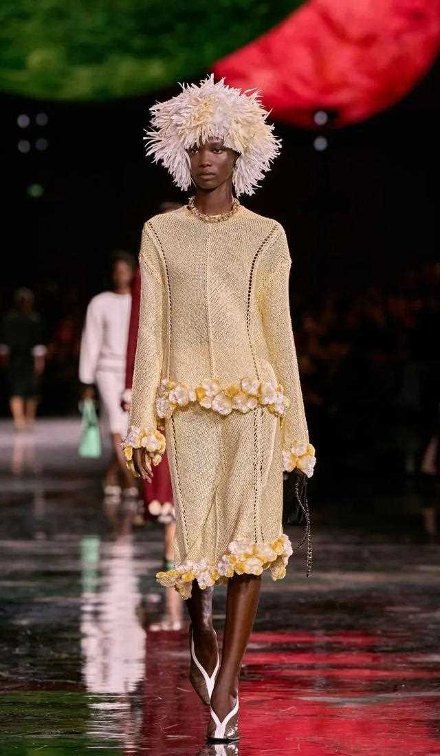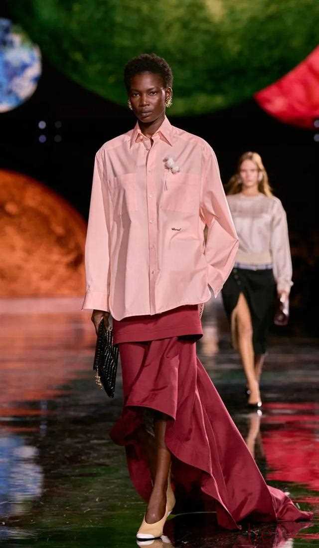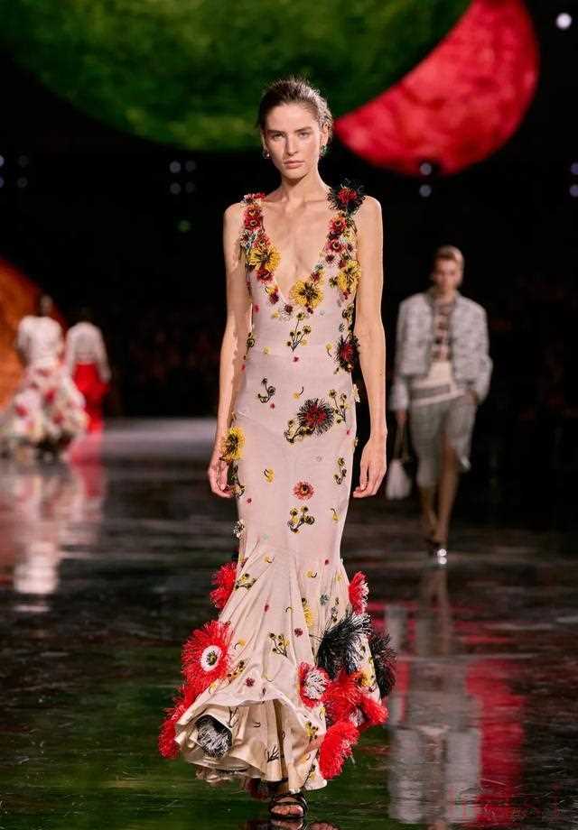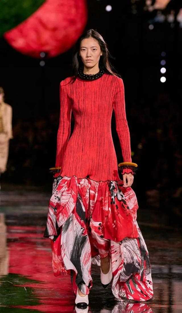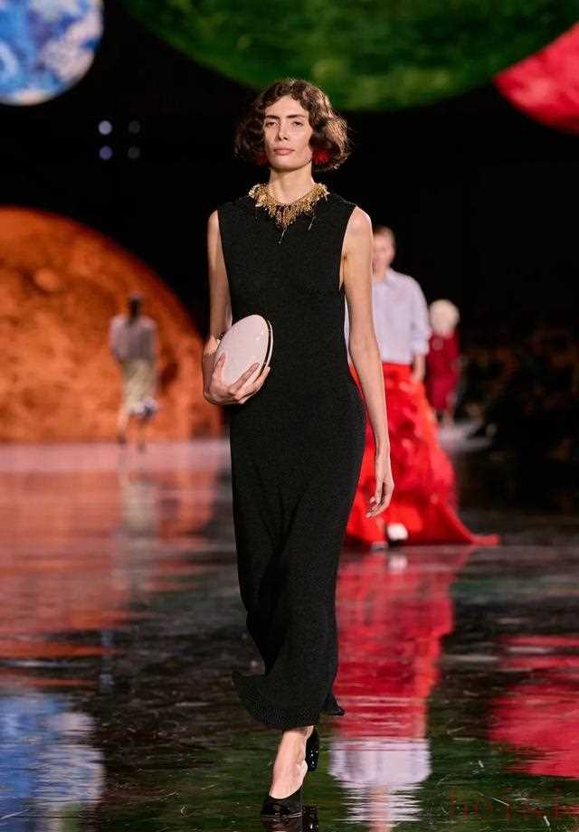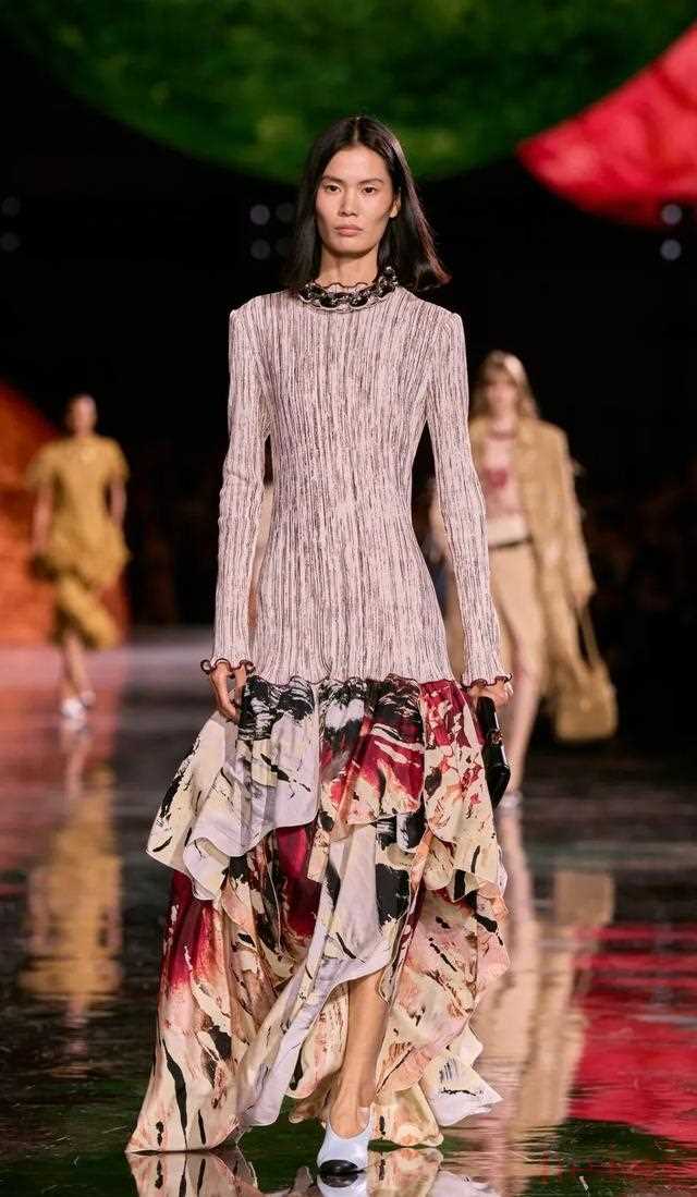"剪裁与廓形:" 从之前一些更中性、硬朗的结构,转向更流畅、更贴合身形、带有柔和女性线条的剪裁。例如,更飘逸的裙摆、更柔和的肩部线条、更注重腰身的设计。