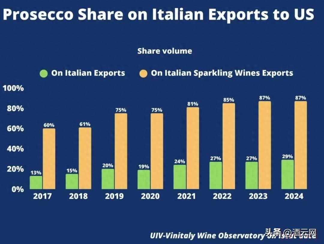 根据意大利葡萄酒展(Vinitaly)与意大利葡萄酒联盟(UIV)的联合分析,普罗塞克在美国市场的份额远高于意大利葡萄酒的整体平均水平(即27%比24%),创下历史新高。而这一纪录除2020年(受到新冠疫情的大幅影响)出现短暂停滞外,多年来持续保持增长,并在2021-2024年的随后四年间东节节攀升,销售额累计增长了90%。