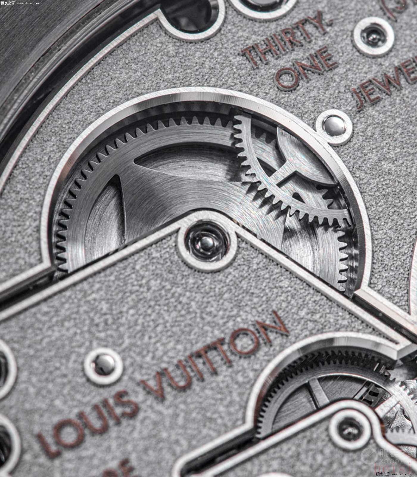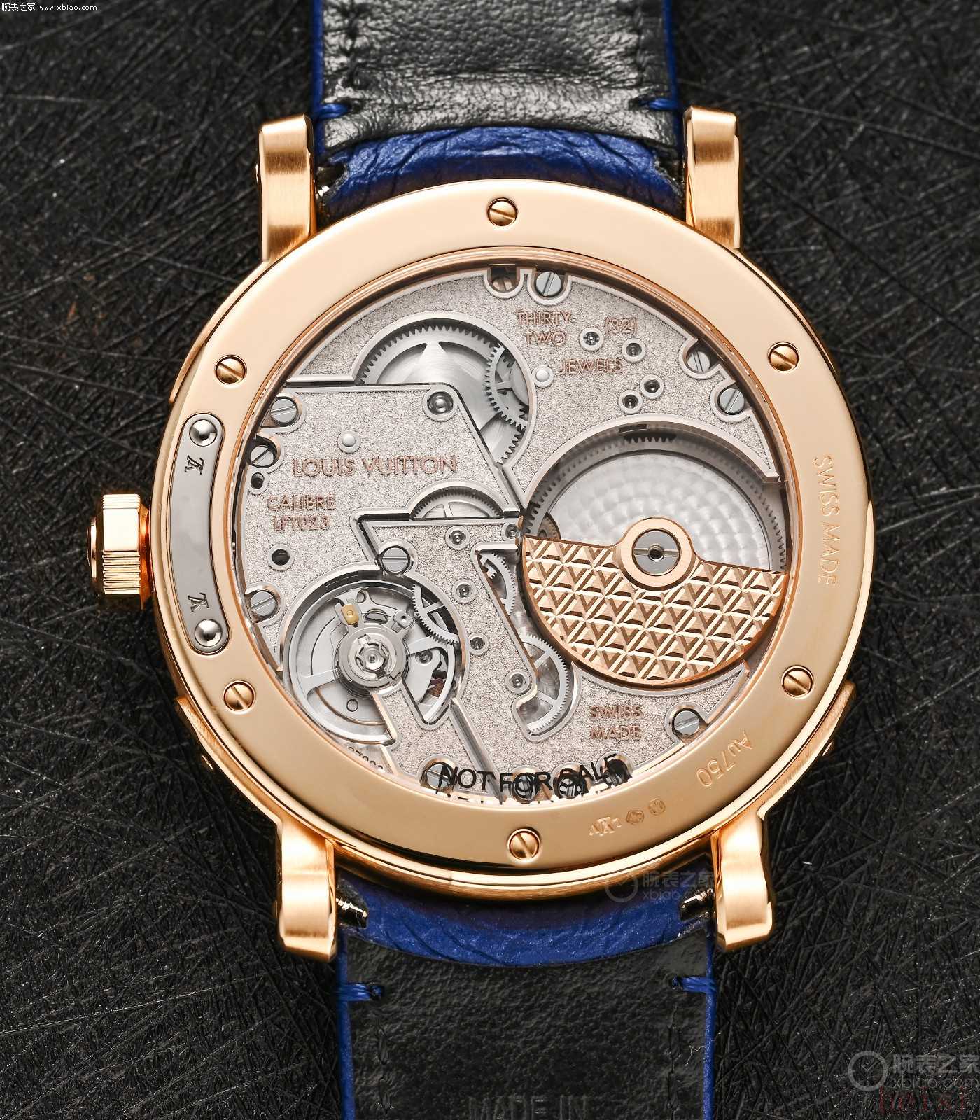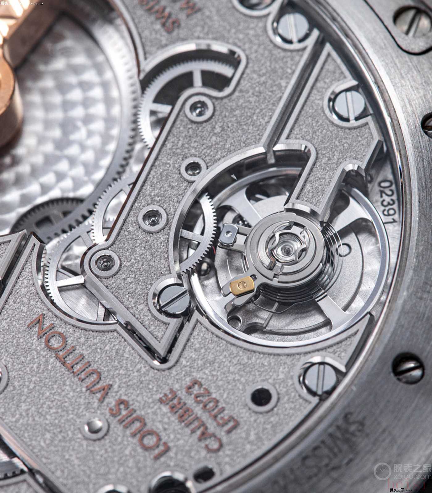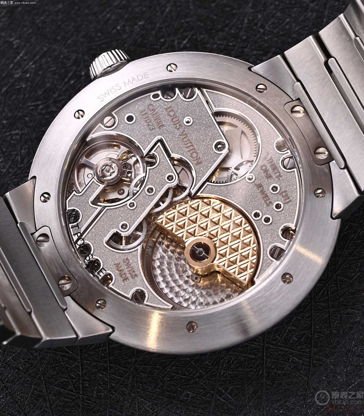 在机芯装饰细节上,22K金自动陀上雕满了连续的LV花纹;发条盒齿轮,做成了“LV老花”造型。整枚机芯,精美且富有LV独有创意,在一流打磨水准之外,机芯动力50小时,有天文台认证,每天误差-4/+6秒标准。