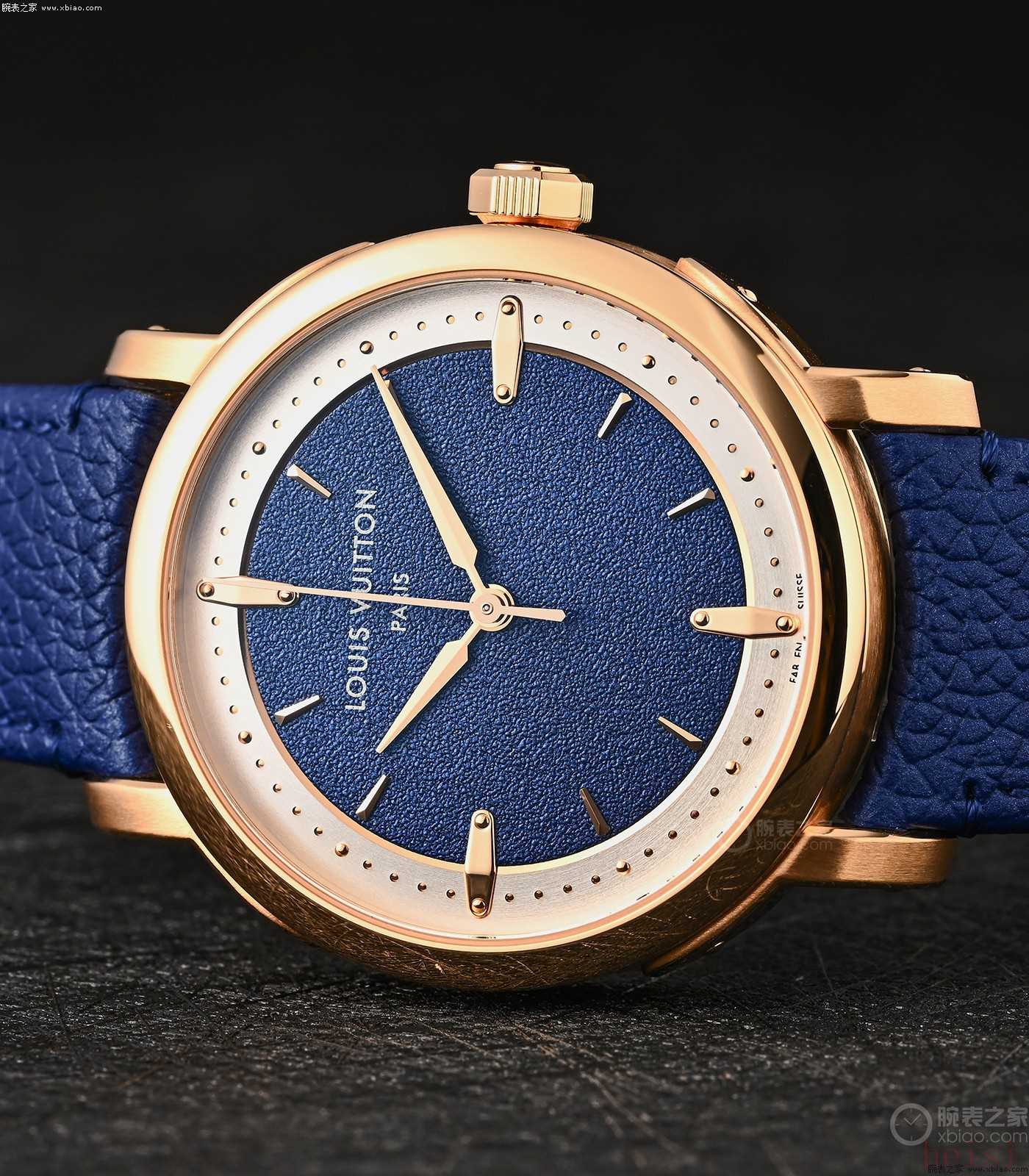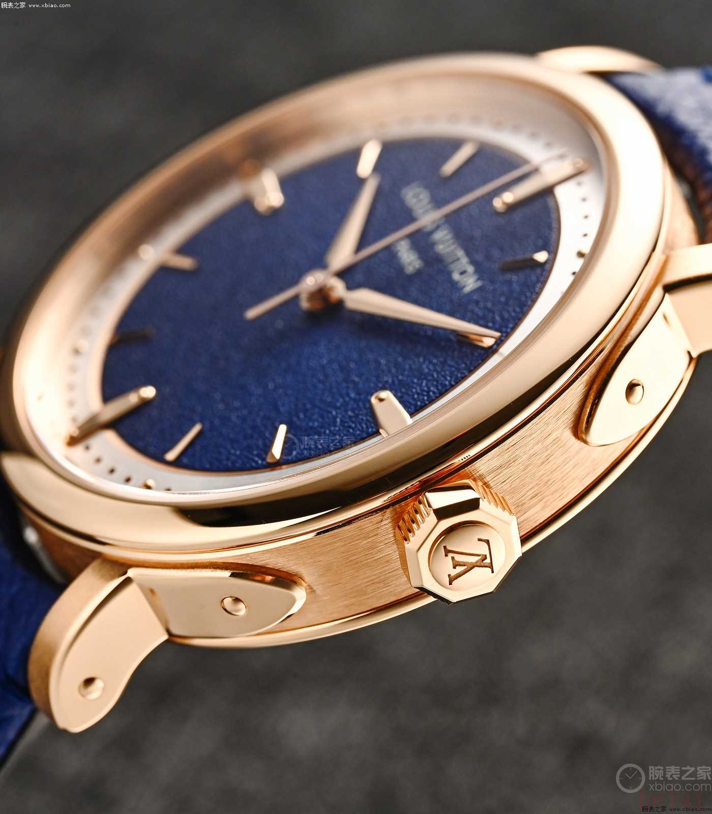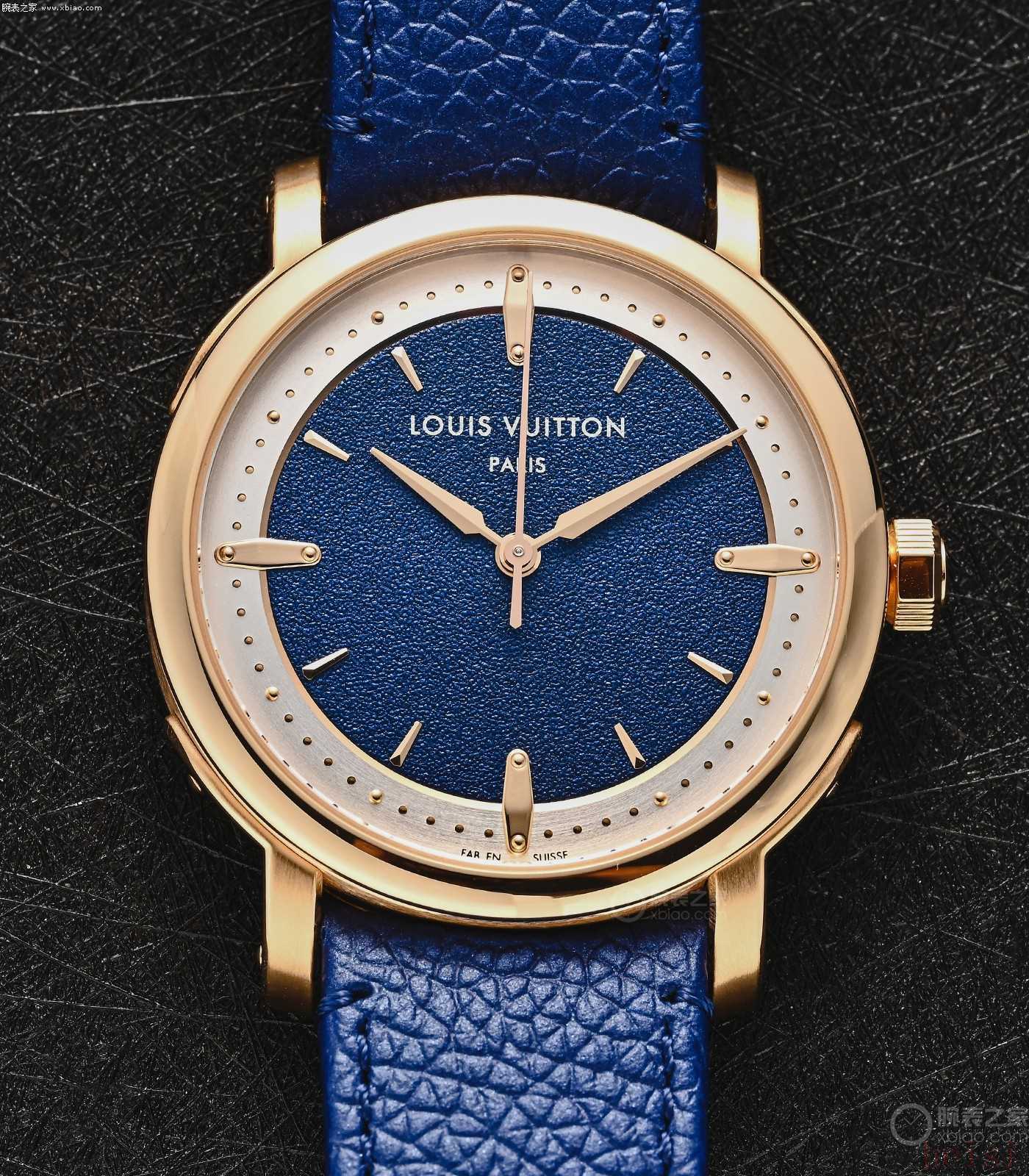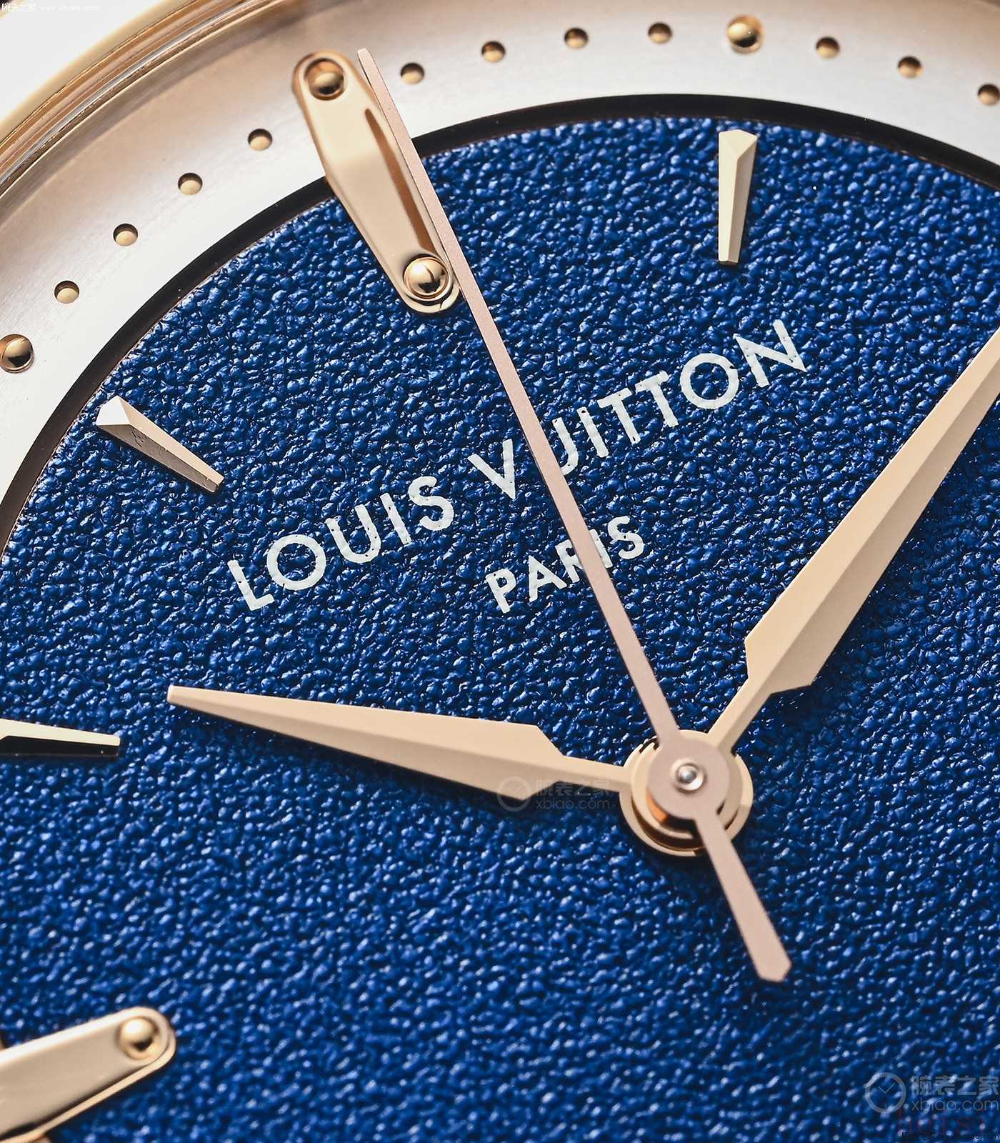 玫瑰金款ESCALE大三针,表盘模仿了LV老花帆布的颗粒感。