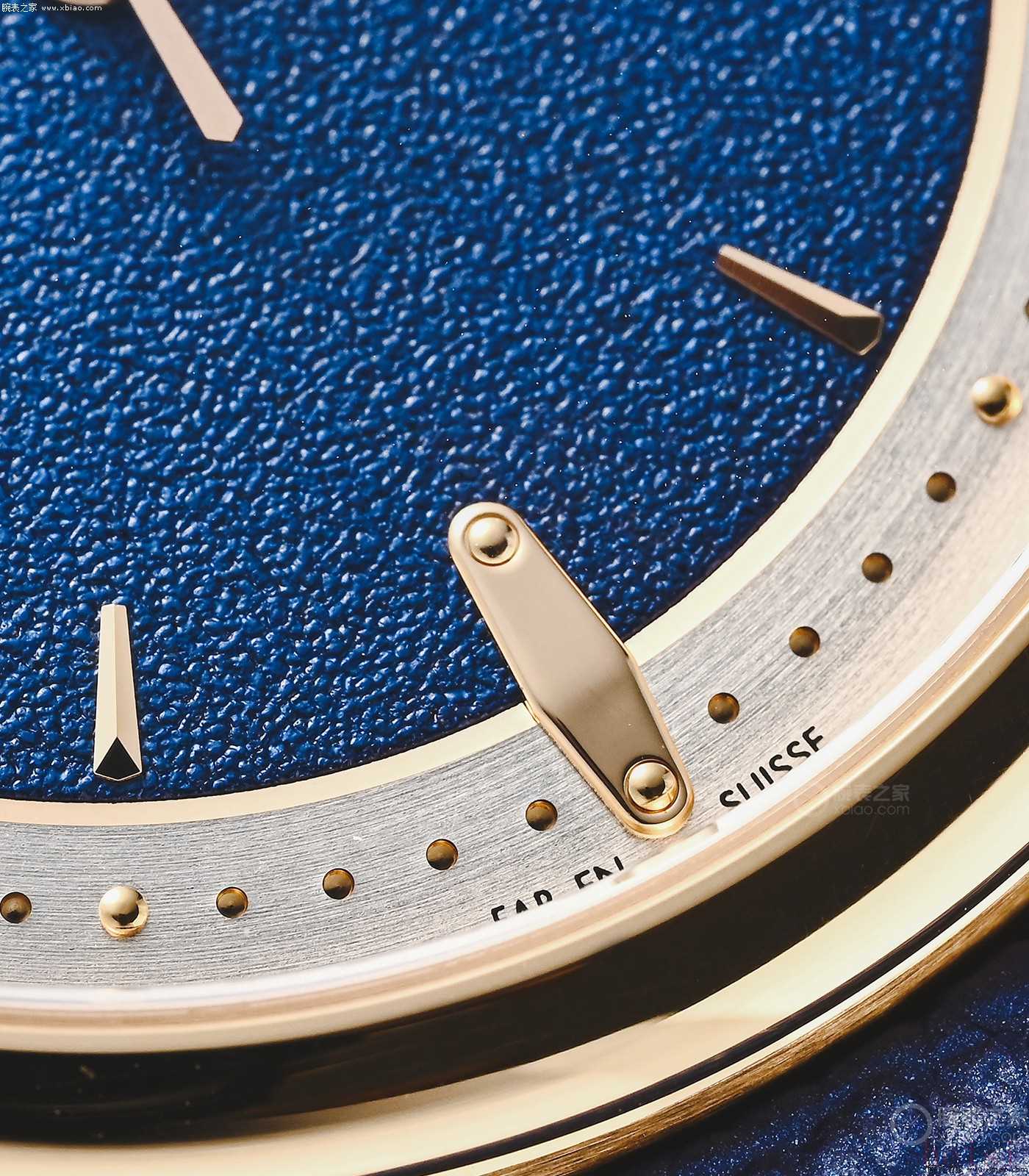 一个细节是,盘面指针、时标,都是实金的,唯独秒针是钛的(钛镀金)。我想,这是因为,原本LFT023珍珠陀机芯,是小三针机芯,在ESCALE上变成了大三针表,所以用更轻的钛金属做大秒针,保证机芯50小时动力,不受影响。