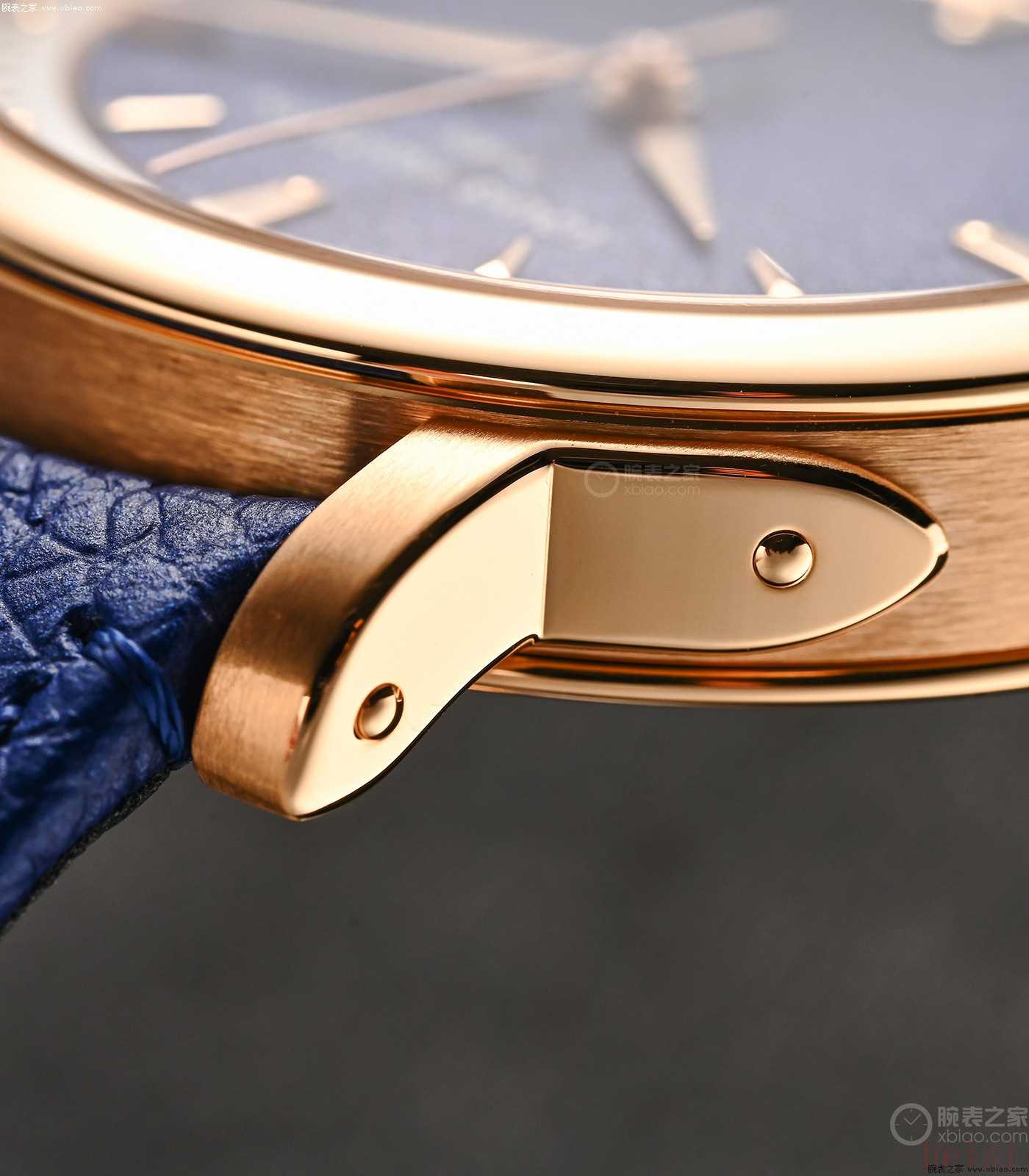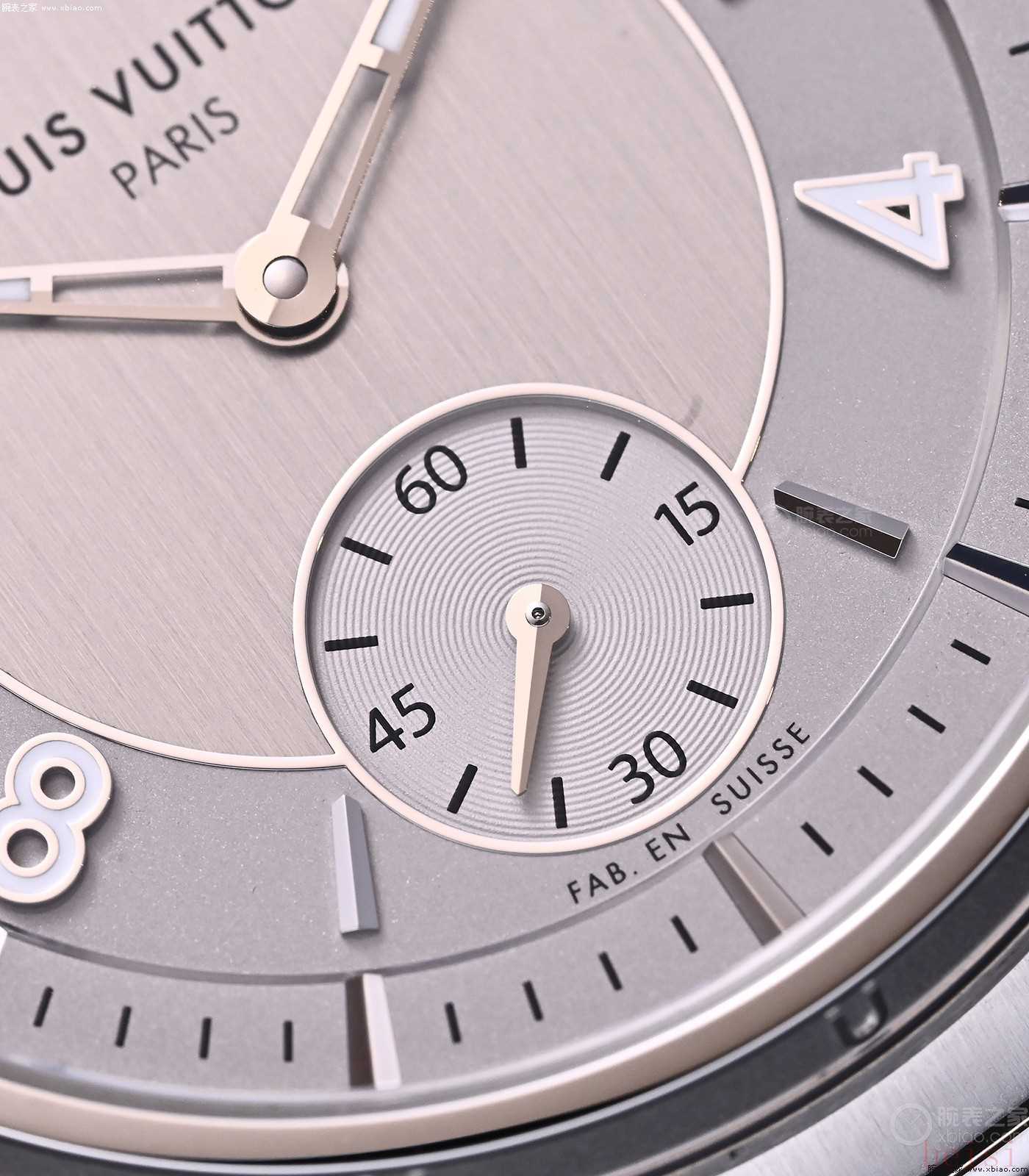 咱们再看表盘。手表盘面,分内外两部分。盘面外圈,有环形拉丝和珠粒刻度。12、3、6、9点位时标,模仿了LV箱包上的“五金”造型,并将表盘内外连接在一起。手表内圈,是LV新一代ESCALE的另一大精髓所在。内圈盘面,玫瑰金款是模仿了LV老花帆布的颗粒装饰;而一旦上升到价值更高的铂金款,内圈盘面,直接配“陨石盘”、“缟玛瑙盘”或“玑镂纹珐琅盘”,珠宝价值、艺术价值一下就上去了。大幅增加了ESCALE的附加值。