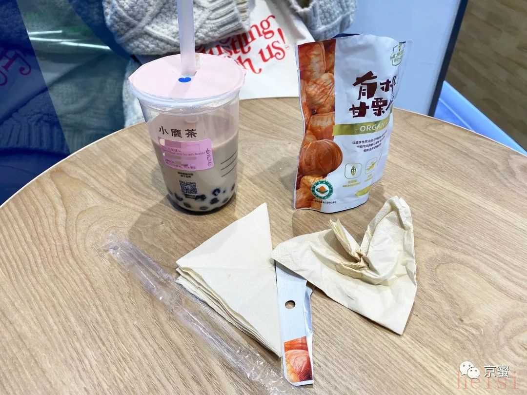 走进店面后,京蜜发现,店内实际空间更为逼仄,仅有两处供顾客在店享用饮品的桌椅,每处为两把椅子和一个小圆桌,正如一位顾客所说,“还是更适合外带”。而且,在靠近门旁的桌子上,顾客喝剩的饮品、吃剩的坚果、零食和餐巾纸留在桌上很长一段时间,一直都没有店员收拾。