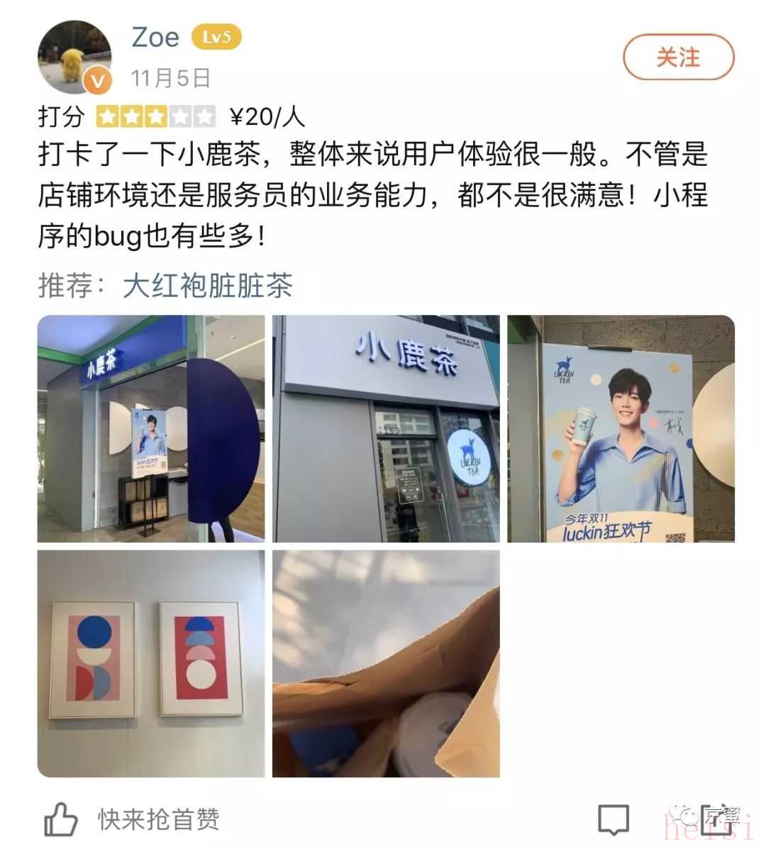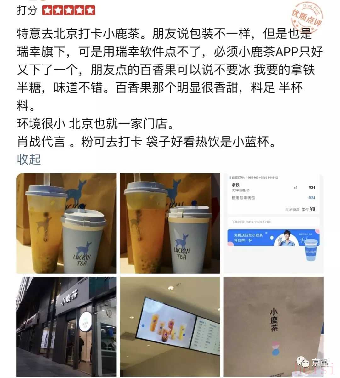 粉丝因为喜欢肖战去小鹿茶门店打卡。图/大众点评网截图