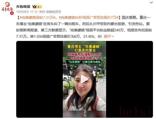 近日,国庆假期期间,重庆一博主“完美婆娘”在街头叫了一辆出租车,然后从沙坪坝到内蒙古旅游引发关注。随后,相关话题冲上热搜。
