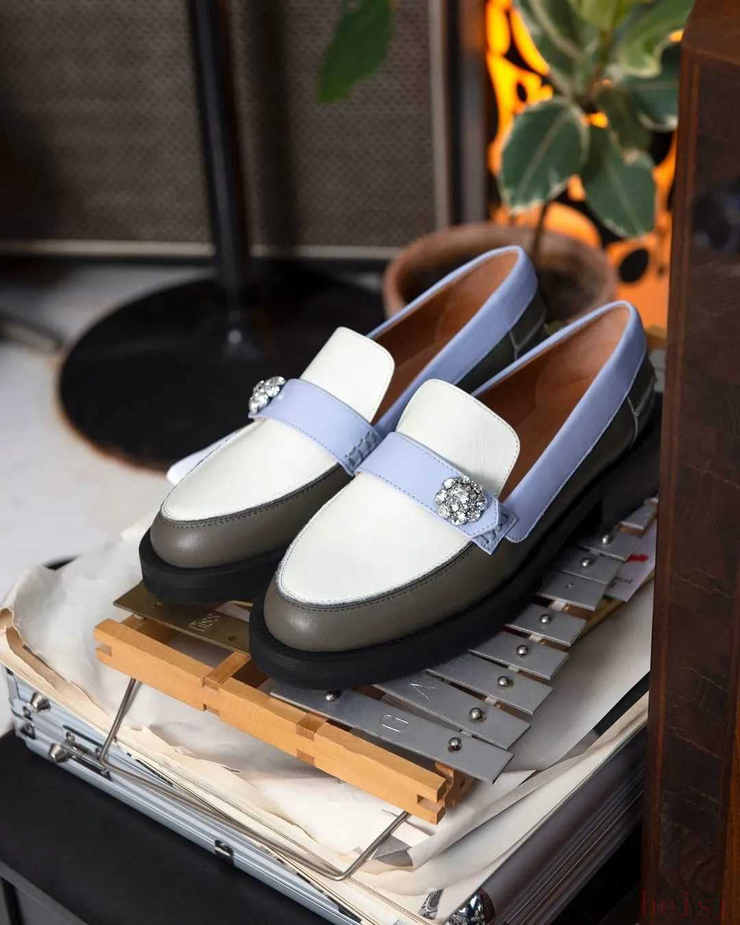 喜欢明亮色彩的,可以看看北欧品牌GANNI。他家在今年推出的乐福鞋上也加入特别的拼色细节设计。色彩活泼的鞋面延续着品牌风格,点缀的水晶纽扣增添了几分精致感。