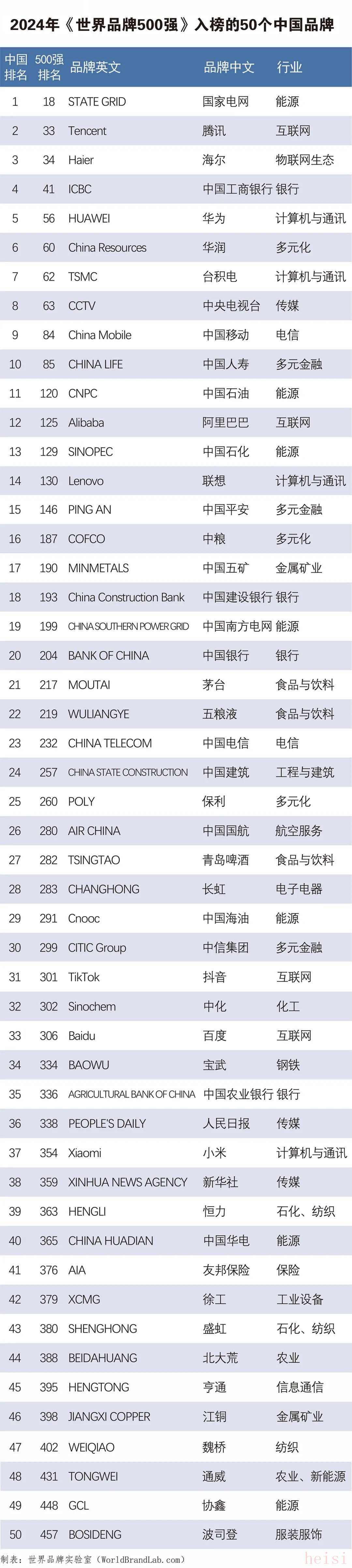 作为全球品牌界的“常青藤”,世界品牌实验室研究成果已成为许多企业无形资产评估的重要依据。按照品牌影响力的三项关键指标,即市场占有率(Market Share)、品牌忠诚度(Brand Loyalty)和全球领导力(Global Leadership),世界品牌实验室对全球约8000多个知名品牌进行了综合评分,最终推出了世界最具影响力的500个品牌。2024年世界品牌500强榜单中,美国稳居品牌大国第一,中国品牌入选数(50个)超越日本(42个),稳居全球第三。