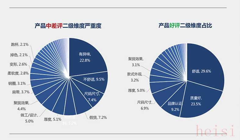 从产品中差评二级维度严重度来看,给出产品中差评的消费者中有22.8%的消费者投诉内衣产品有异味的问题;有9.5%的消费者投诉内衣的不舒适问题;有7.4%的消费者投诉内衣尺寸问题。