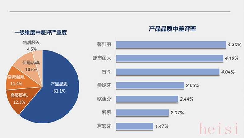 消费者真实反映的负面问题点可以划分为五个业务维度,分别是产品品质、物流服务、促销活动、客服服务和售后服务,其中消费者反映产品品质问题严重度最高,其严重度为61.1%。具体到品牌来看产品品质,馨雅丽产品品质中差评率最高,其次是都市丽人。