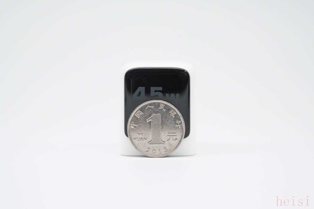 航嘉灵动 F45 Neo 安全快充与一元硬币对比大小,可以看出充电器在非常小的体积下仍旧做到了折叠插脚设计以及 45W 输出,实力可见一斑。