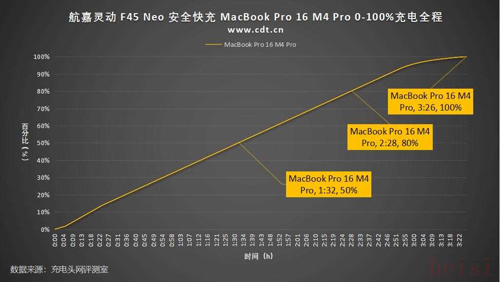 实测航嘉灵动 F45 Neo 安全快充为MacBook Pro 16 M4 Pro充电50%耗时1小时32分钟,充电80%耗时2小时28分钟,充电100%耗时3小时26分钟。