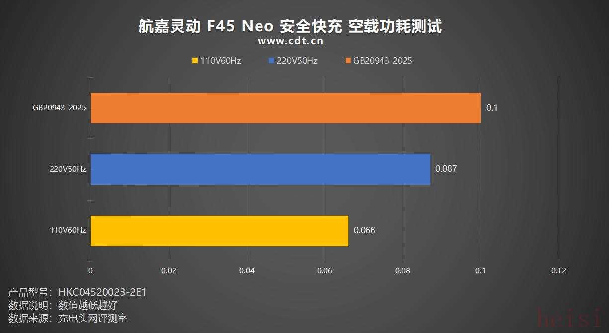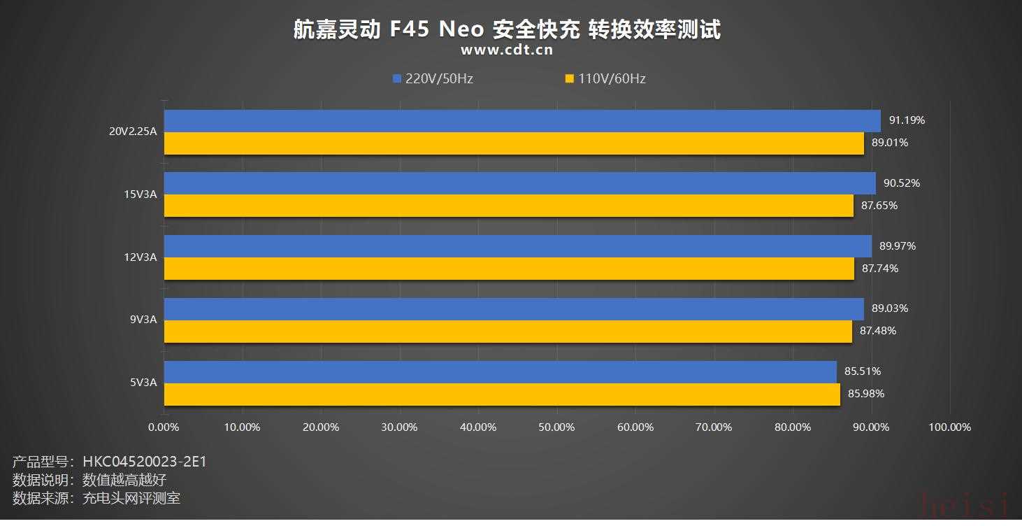 整体来看,航嘉灵动 F45 Neo 安全快充 在两类电压下的转换效率在同类充电器中属于主流水平,表现不错。