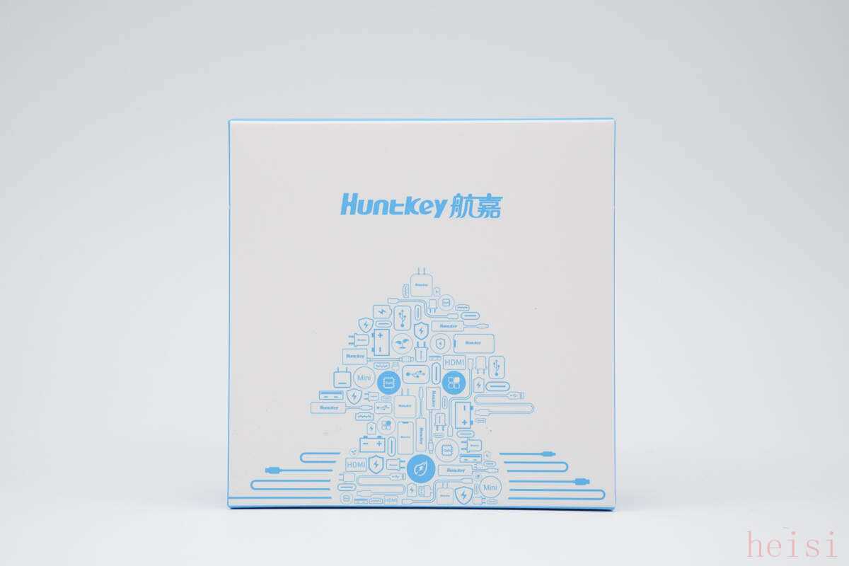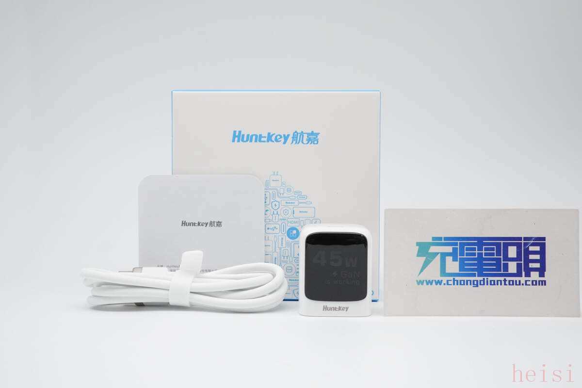 航嘉灵动 F45 Neo 安全快充包装采用航嘉经典蓝白设计,中间印有“Huntkey 航嘉”LOGO,下方则是航嘉IP形象潮流涂鸦。