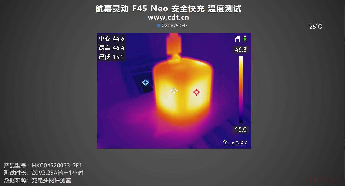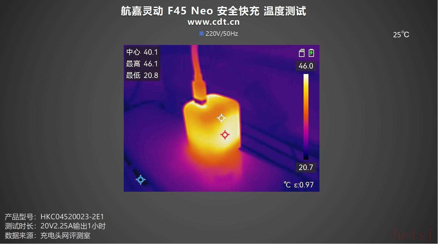 充电器是一种转换设备,充电过程中会有损耗,以热量的形式散发出来,所以充电器会发热。航嘉灵动 F45 Neo 安全快充 支持 PD 45W 输出,将充电器放置于25℃的恒温箱中,以20V2.25A负载一小时后采集充电器表面的温度。
