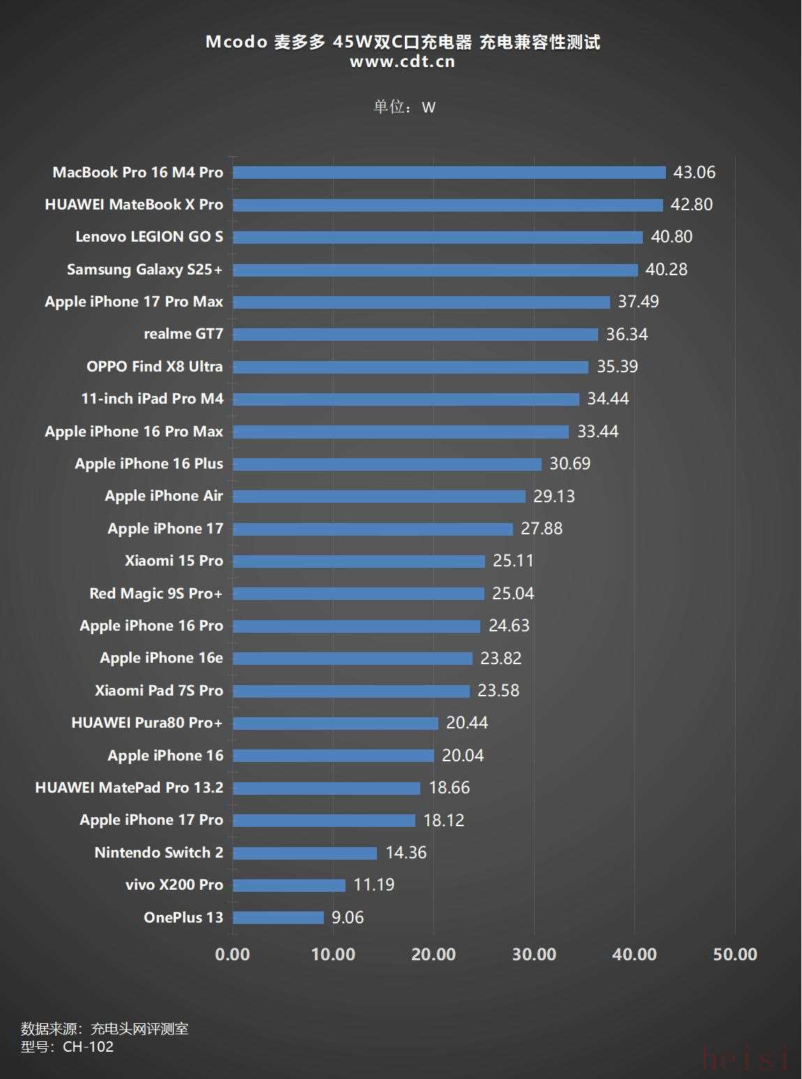 将充电功率数据绘制为柱状图,可以看到测试设备中MacBook Pro 16 M4 Pro(43.02W)充电功率最高,其余笔电、掌机功率在40W以上,而苹果系产品充电功率基本都在30W以上,与原装充电功率无异,其他品牌手机充电功率基本在15W-26W之间,也都能达到快充状态。