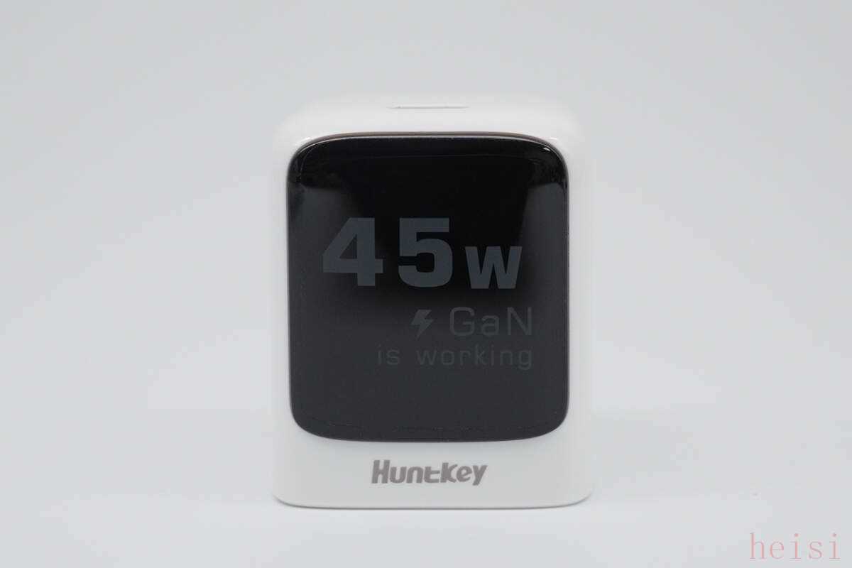 航嘉灵动 F45 Neo 安全快充为方块圆润造型,四周过渡圆润,整体非常灵动小巧。航嘉灵动 F45 Neo 安全快充正面印有“Huntkey”航嘉英文品牌字样,上方则是一块支持个性化定制丝印的区域。默认标注 “45W”、“GaN” 字样。