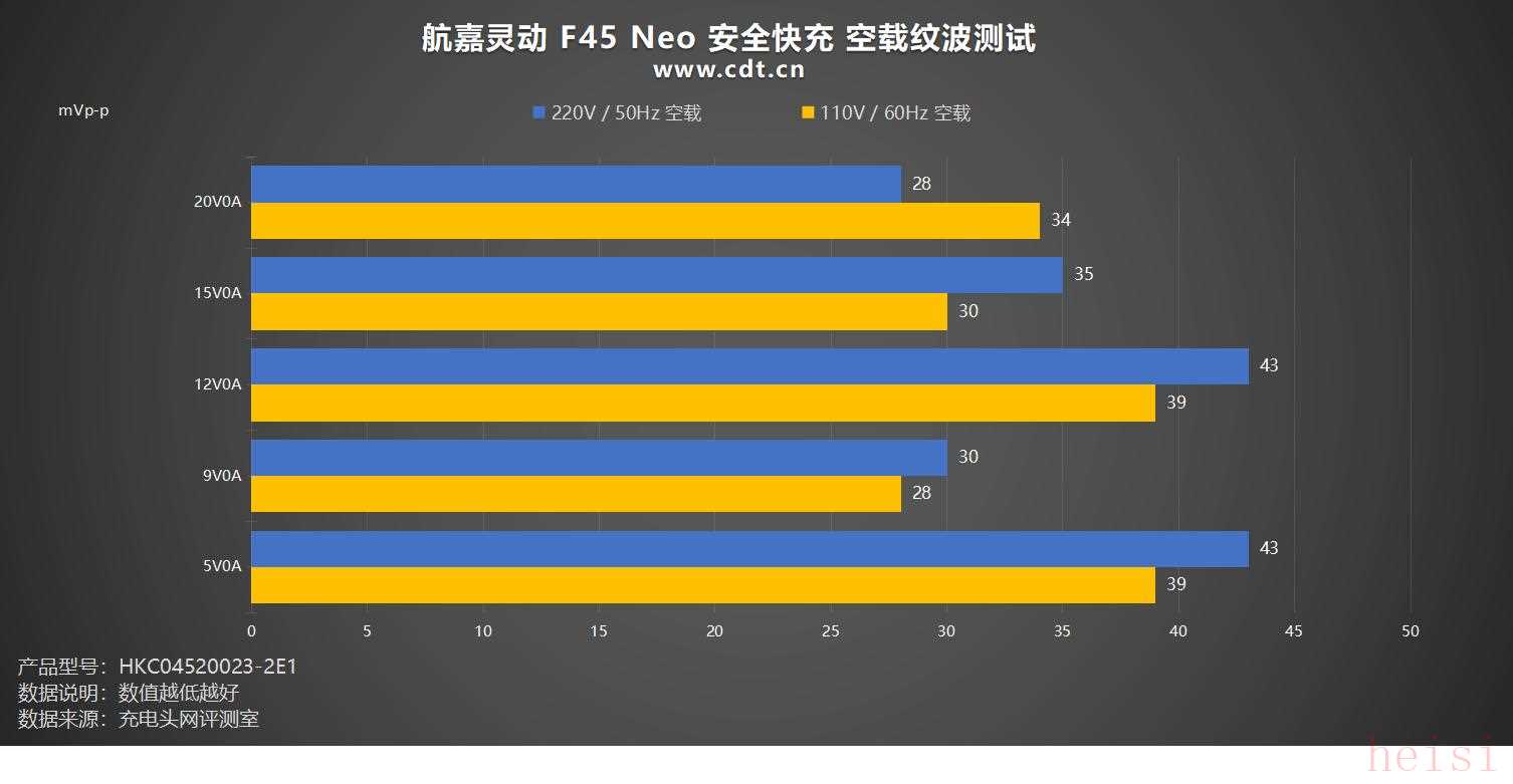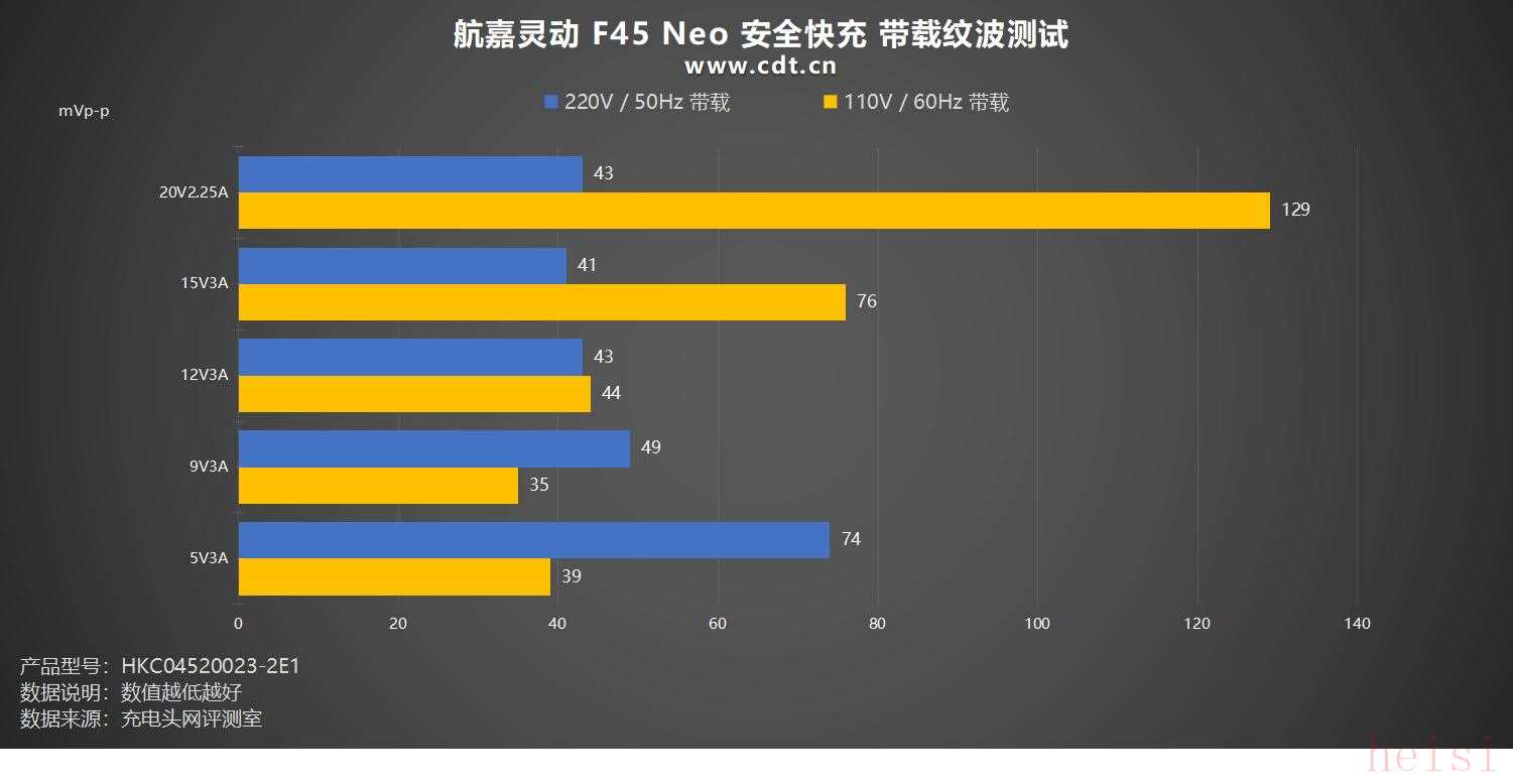 YD/T 1591-2009 通信行业标准中充电器纹波要求是不高于200mVp-p,航嘉灵动 F45 Turbo 安全快充 在220V 50Hz,纹波均不高于129mVp-p,表现较为稳定。