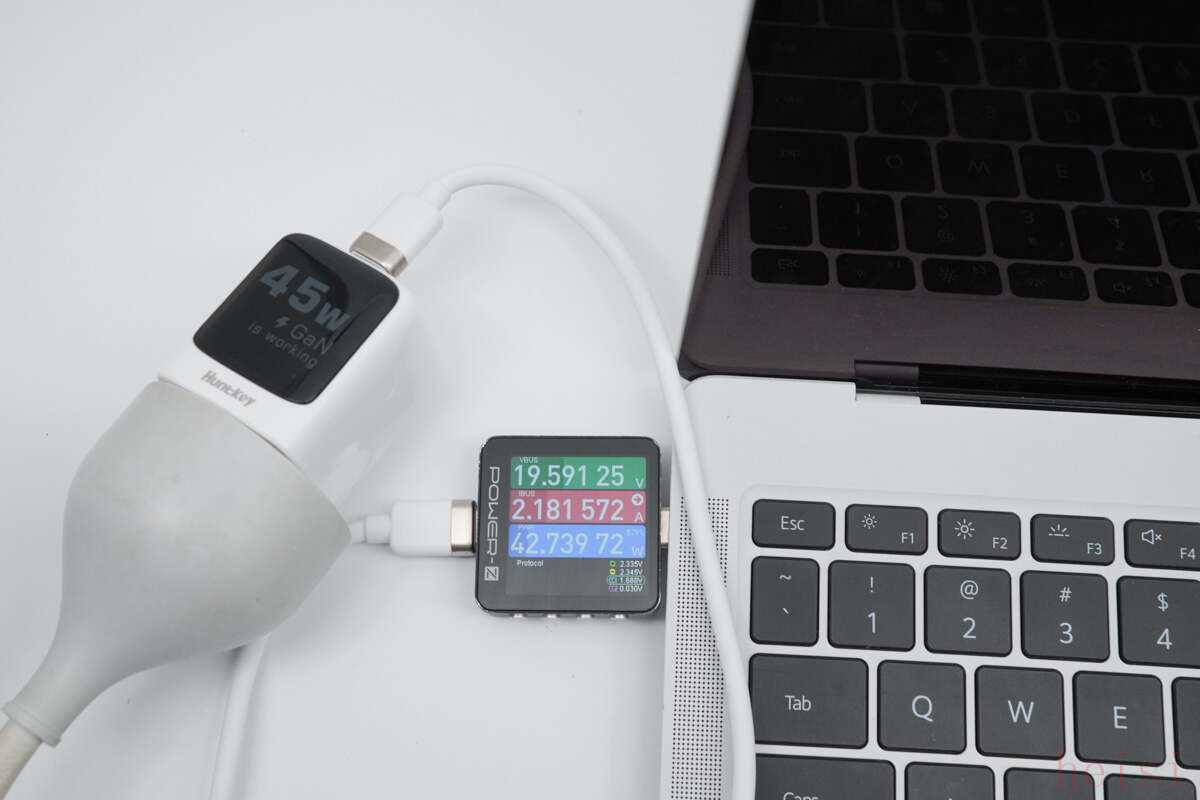 使用航嘉灵动 F45 Neo 安全快充为华为 MateBook X Pro 充电,实测功率可达 19.59W。
