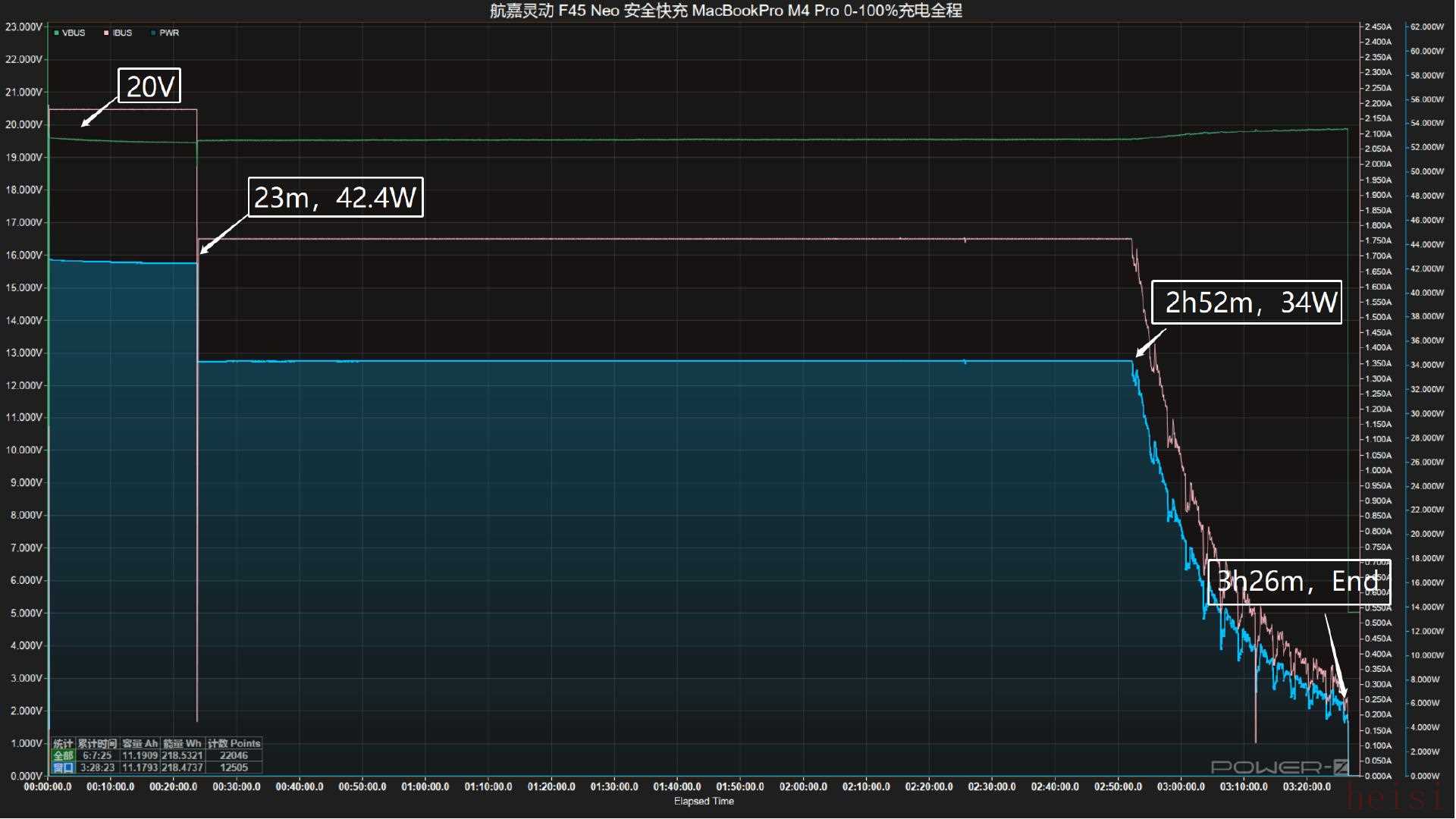 接通电源后,握手20V电压,以42.4W的充电功率持续至23分钟,随后功率下降至34W并持续至2小时52分钟,随后功率持续下降直至充满,全程耗时3小时26分钟。