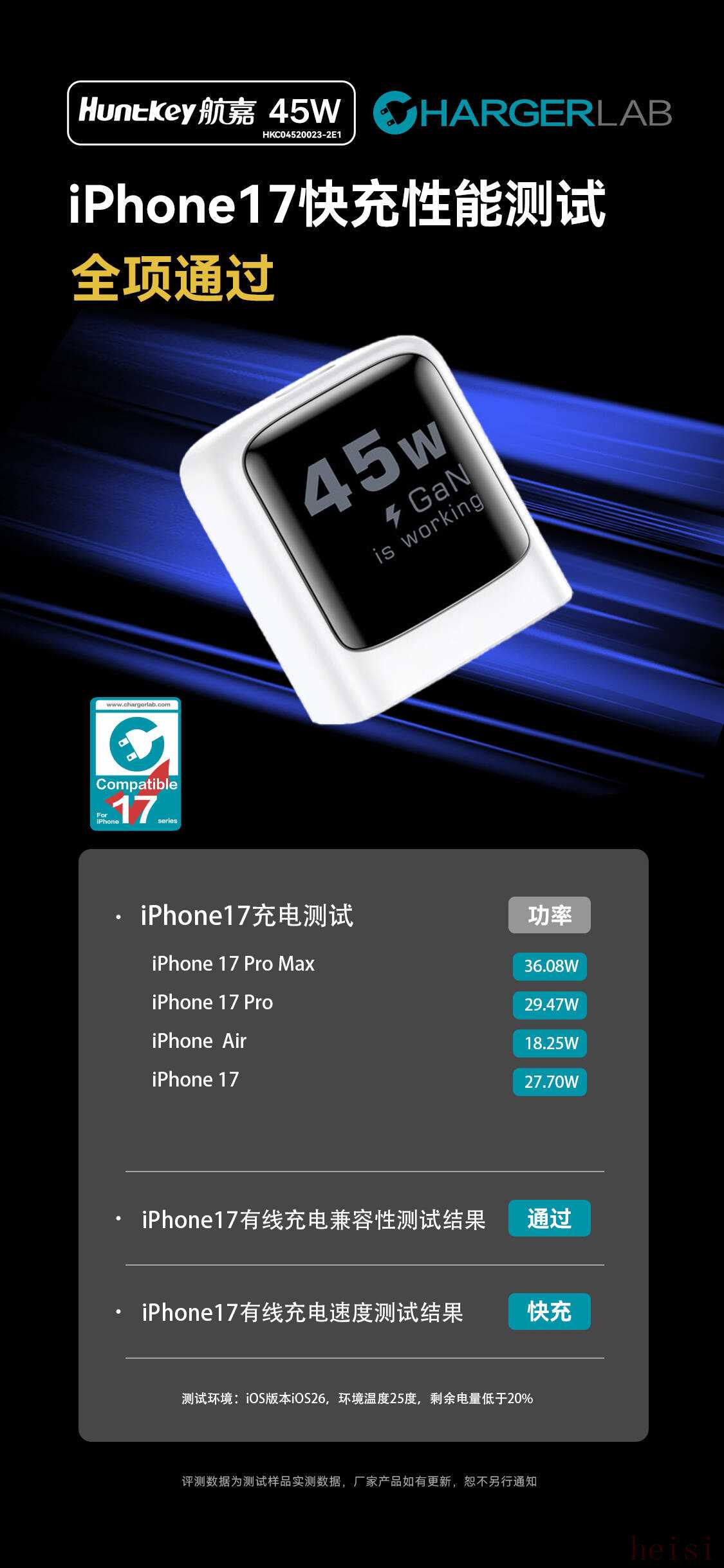 通过充电头网对iPhone 17全系充电测试,航嘉灵动 F45 Neo 安全快充对iPhone 17全系均能通过有线充电兼容性测试,在有线充电速度中,实测对iPhone 17 Pro Max 22分可充入 50%电量,充满仅需1小时30分钟,与苹果原厂40W充电速度基本一致,综上所述,航嘉灵动 F45 Neo 安全快充通过ChargerLAB iPhone 17 快充性能测试。