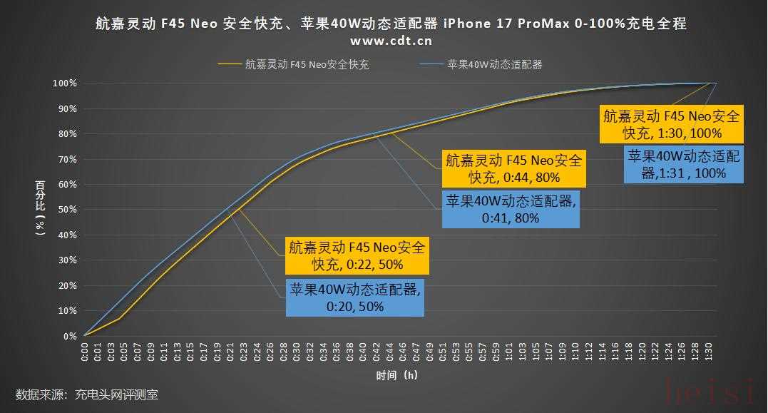 将苹果40W动态适配器进行对比,可以看到航嘉灵动 F45 Neo 安全快充整体充电曲线走向基本一致,前段充电50%仅比原装稍慢2分钟,手机充满时比原装快1分钟,已达到原装充电速度,十分不错。