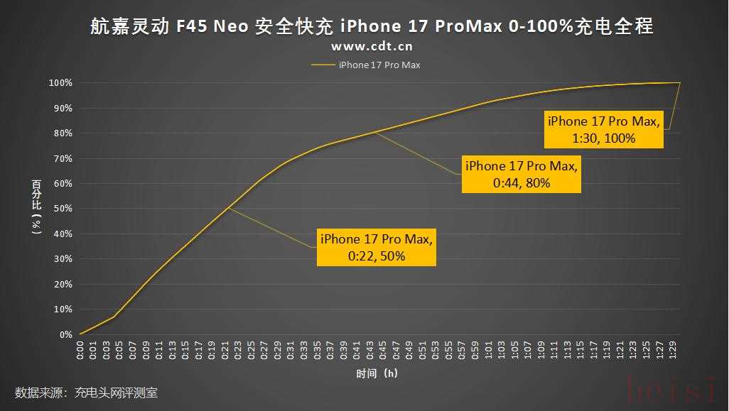 绘制出折线图,可以看出,航嘉灵动 F45 Neo 安全快充 为 iPhone 17 Pro Max 充电至50%耗时22分钟,充至80%耗时44分钟,充至100%耗时1小时30分钟。